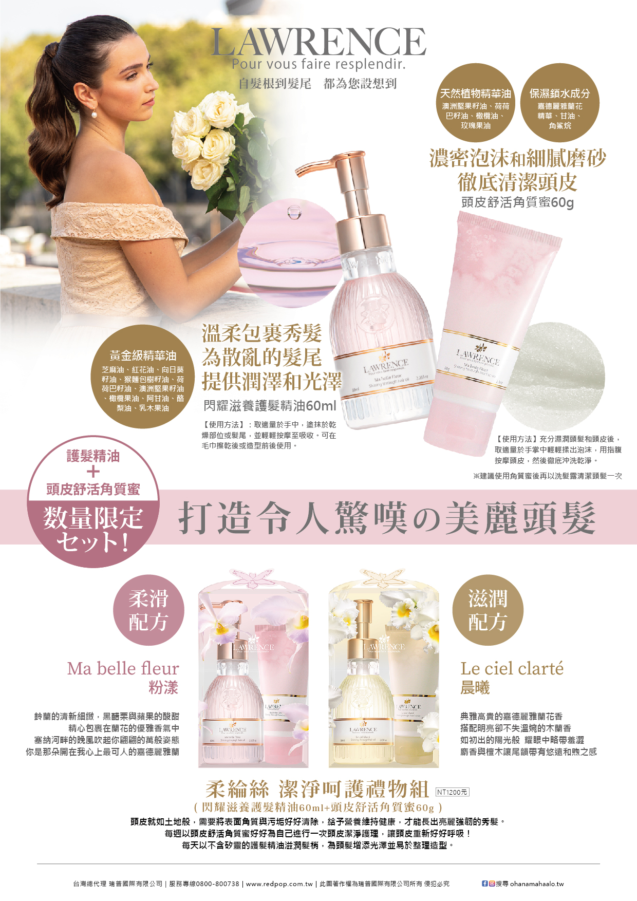 ◆商品內容LAWRENCE柔綸絲-粉漾 潔淨呵護禮物組LAWRENCE柔綸絲-粉漾-閃耀滋養護髮精油60mlX1LAWRENCE柔綸絲-粉漾-頭皮舒活角質蜜60gX1