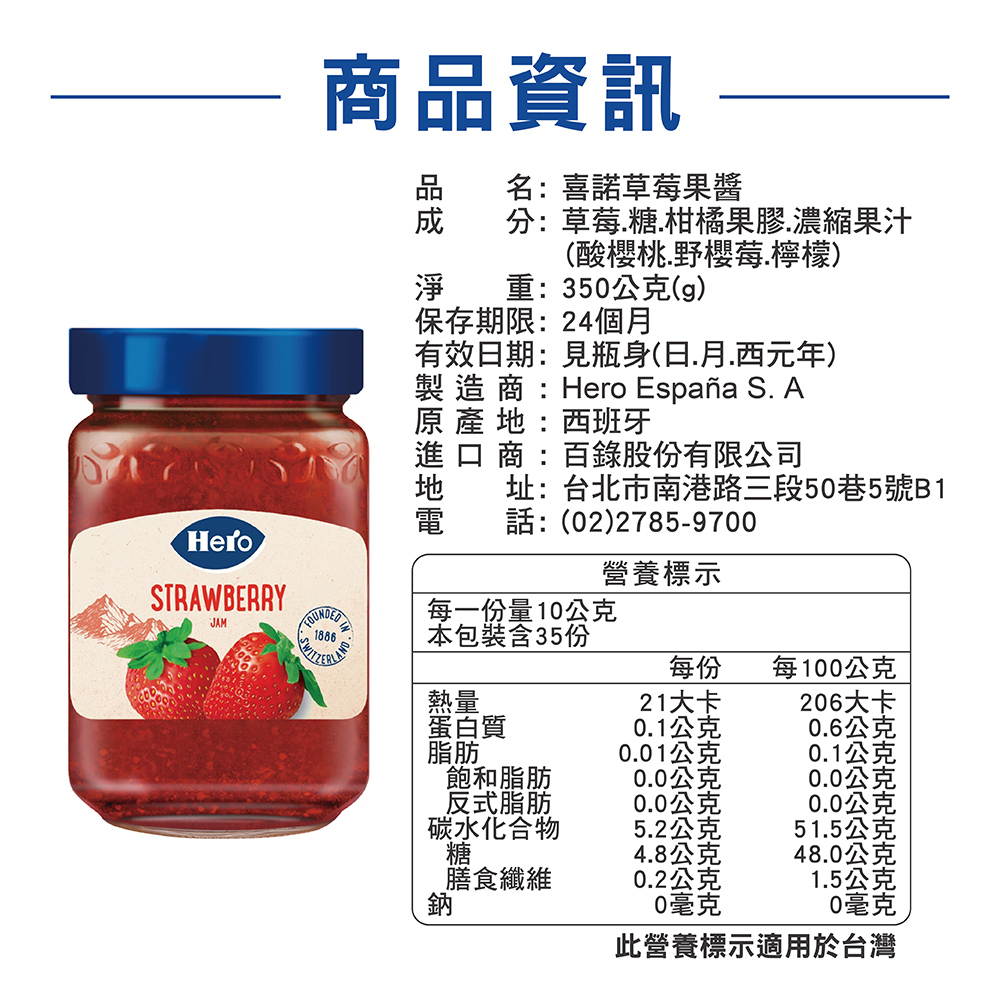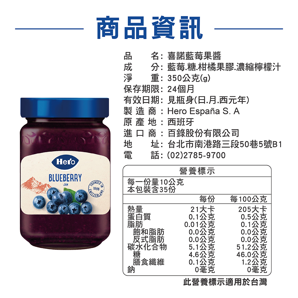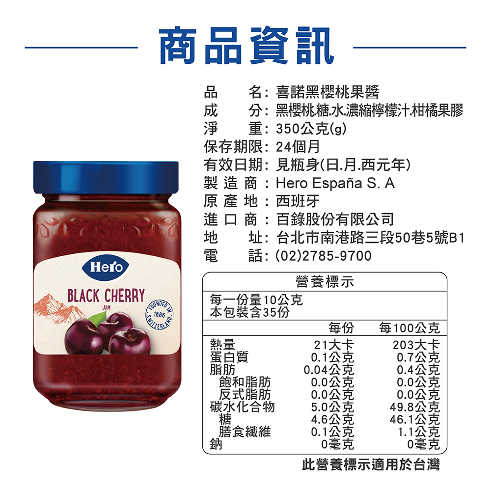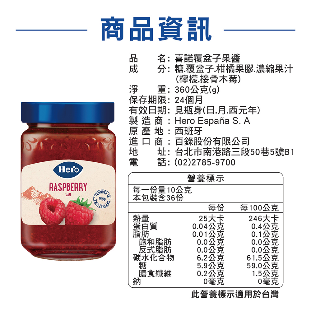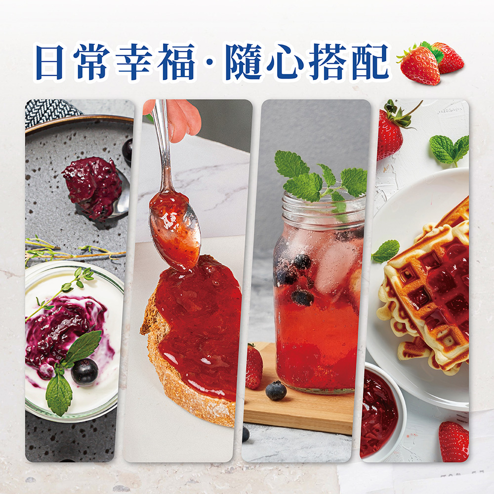 商品口味、容量:草莓(350g/罐)、藍莓(350g/罐)、黑櫻桃(350g/罐)、覆盆子(360g/罐)