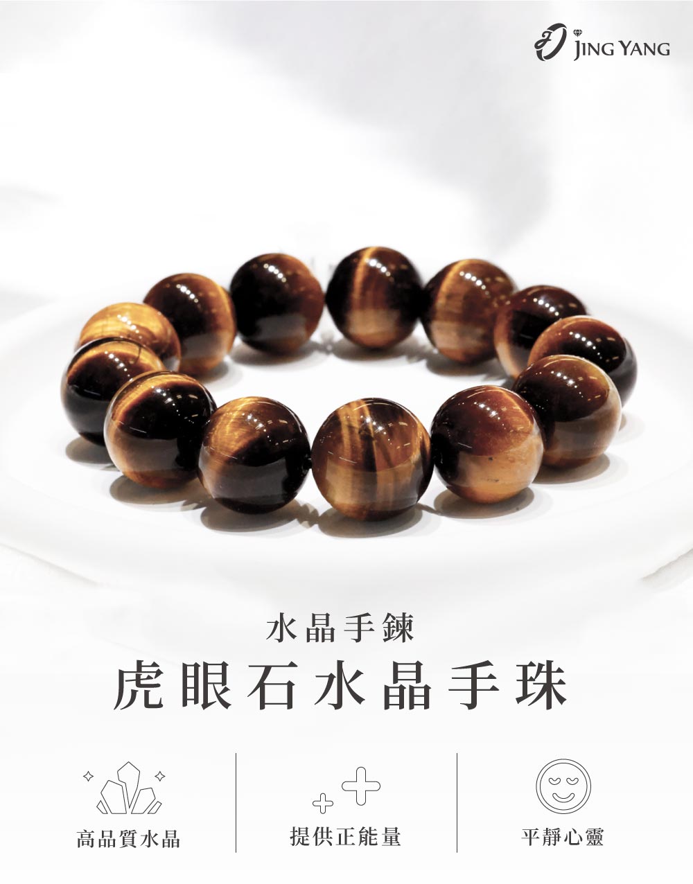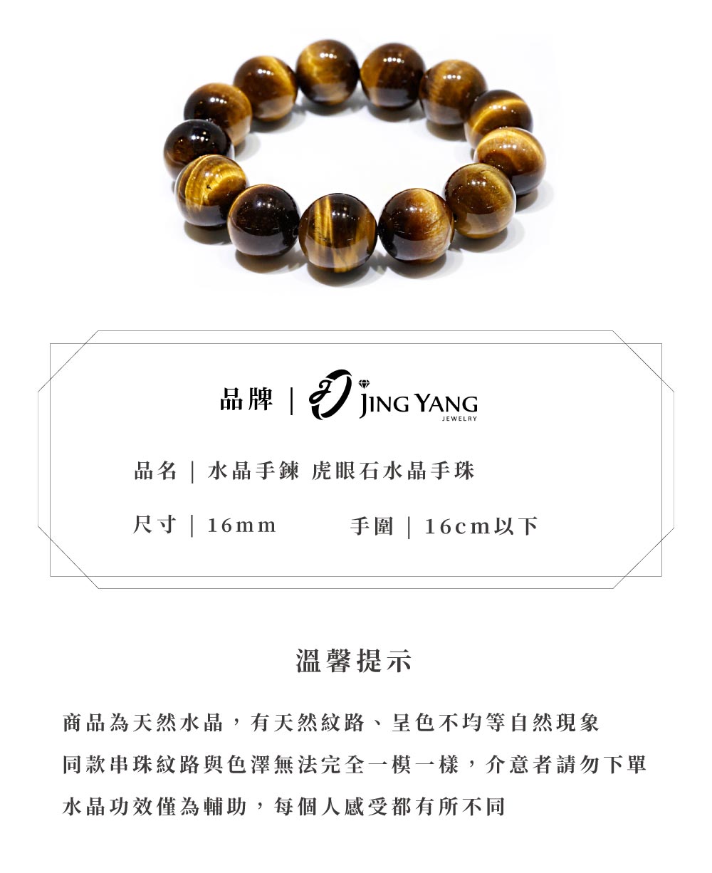【JING YANG 晶漾】天然水晶手鍊虎眼石16mm | 招財 增加自信勇氣 增加能量