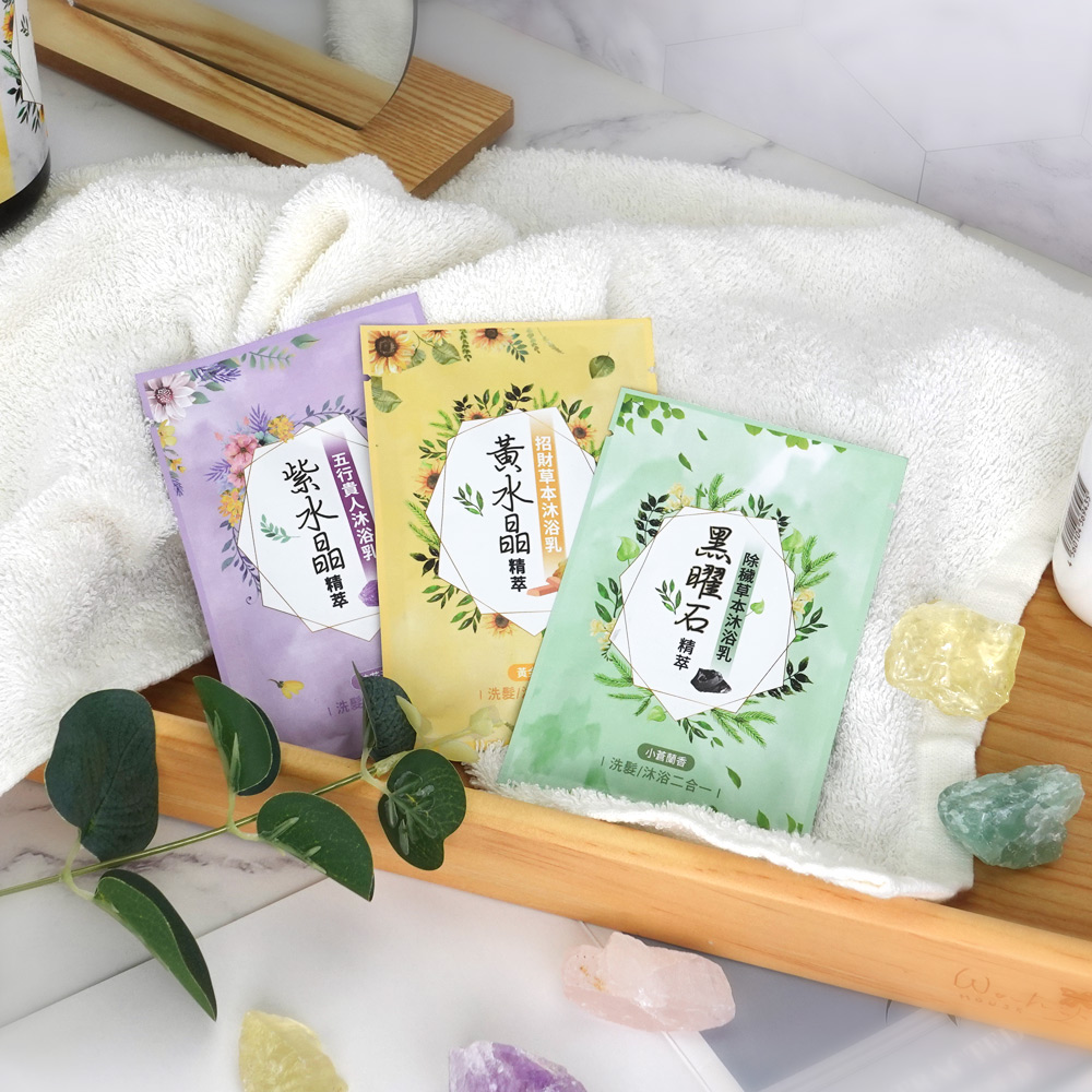 本系列開運配方沐浴乳以最新科學技術萃取各種天然水晶,並添加開運草本獨家開發研製而成。應消費者需求再推出開運隨身包組合,內含三款開運沐浴乳(共12包),包括: