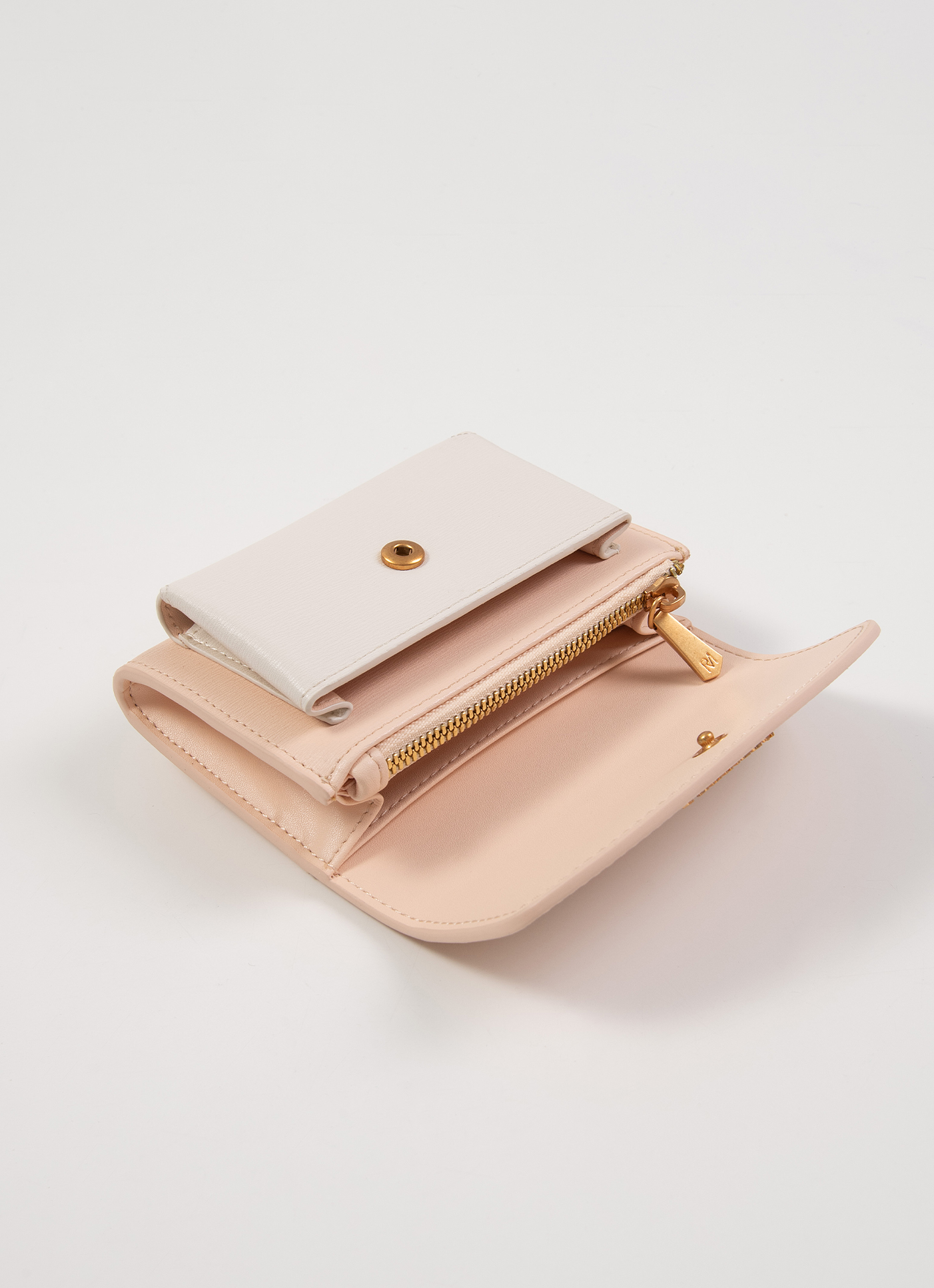 壓扣封口設計ROBINMAY 金屬字母 LOGO優雅撞色短夾,特色信封外型精巧收納空間,可置入少量票卡、零錢、小物