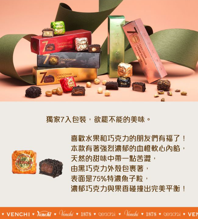 喜歡水果和巧克力的朋友們有福了!本款有著强烈濃郁的血橙軟心內餡,天然的甜味中帶一點苦澀,由黑巧克力外殼包裹著,表面是75%特濃魚子粒,濃郁黑巧克力與血橙果香碰撞出了完美平衡感。享受Venchi甜美滋味只需要一口!獨家7入包裝,欲罷不能的美味。