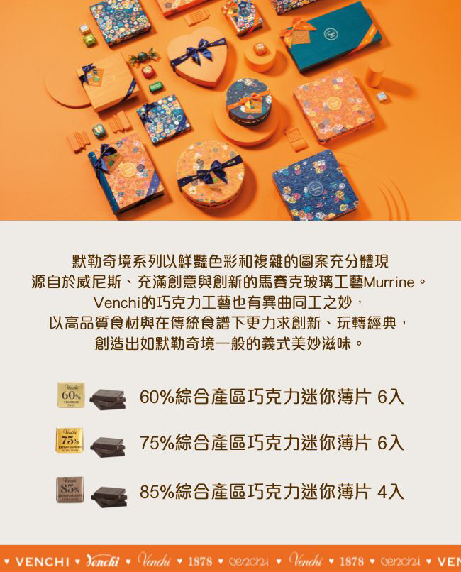 默勒奇境系列以鮮豔色彩和複雜的圖案充分體現源自於威尼斯、充滿創意與創新的馬賽克玻璃工藝Murrine。Venchi的巧克力工藝也有異曲同工之妙,以高品質食材與在傳統食譜下更力求創新、玩轉經典,創造出如默勒奇境一般的義式美妙滋味。