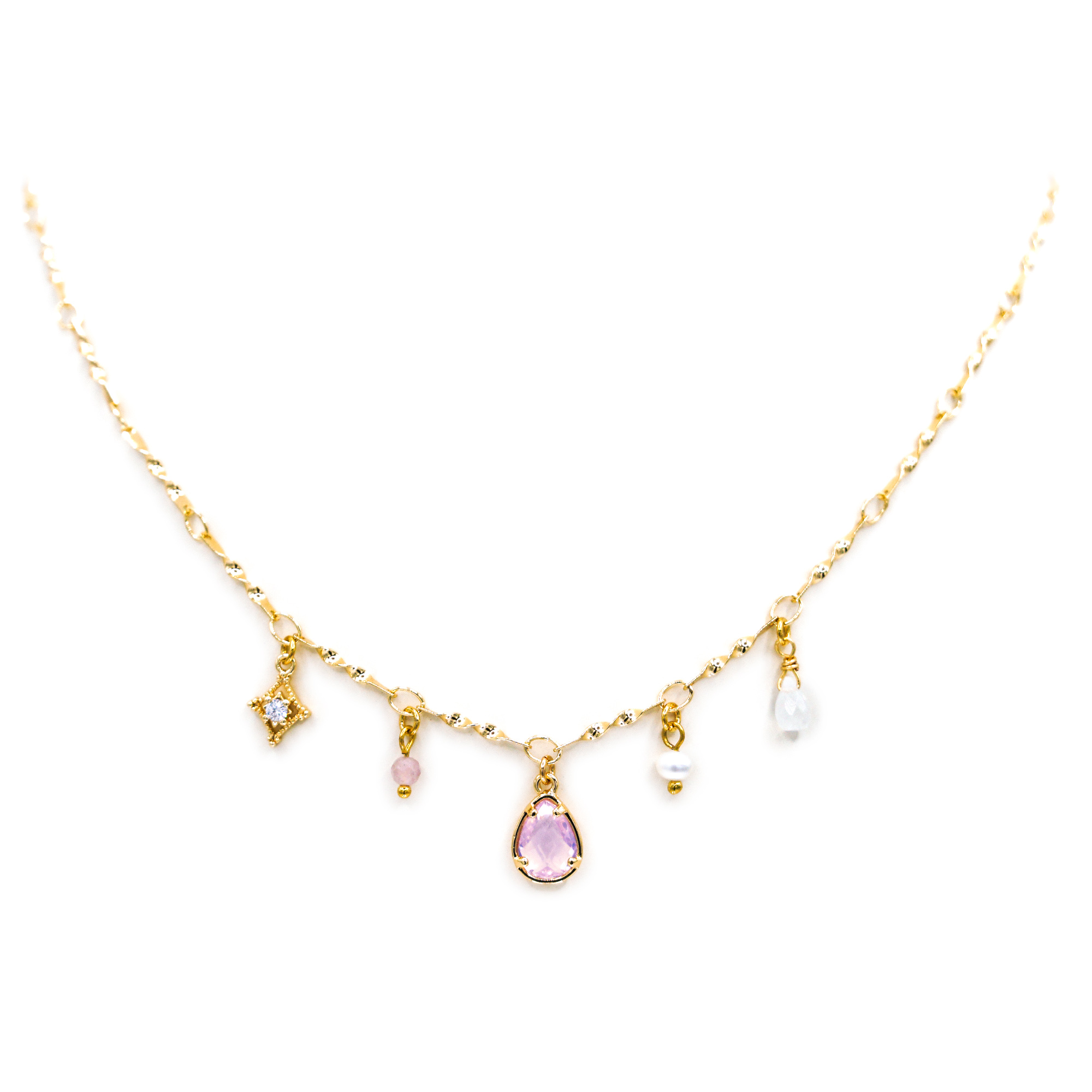 粉晶、粉鋯石、月光石、淡水珍珠、黃銅鍍18K金