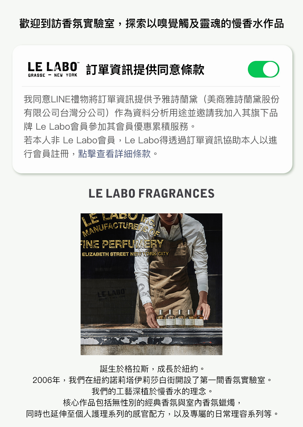 公司名: 美商雅詩蘭黛股份有限公司地址: 台北市信義區松高路9號19樓統一編號: 23472620負責人: 鄧曉華客服信箱: Consumercare-tw@lelabofragrances.com客服時段(國定假日除外):週一~週五 9:30~17:30
