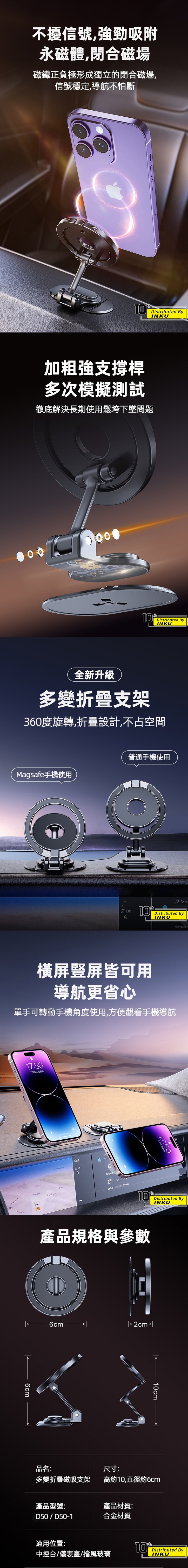 產品參數品名:多變折疊磁吸支架尺寸:高約10,直徑約6cm產品型號:D50 / D50-1產品材質:合金材質適用位置:中控台/儀表臺/擋風玻璃