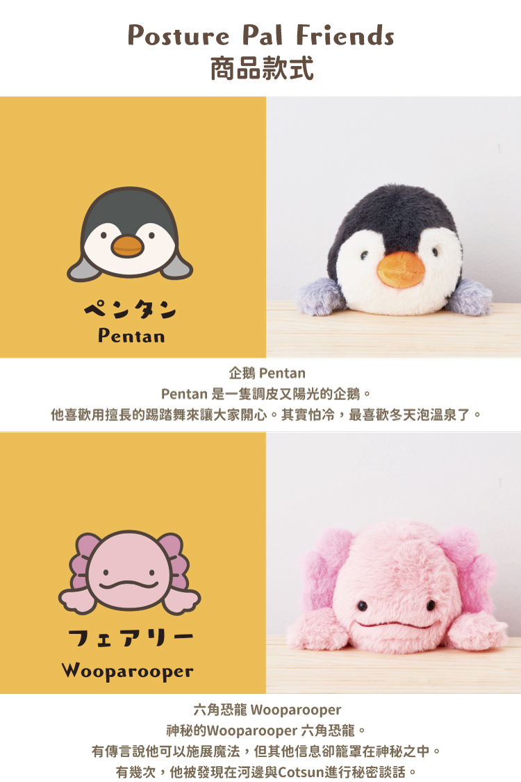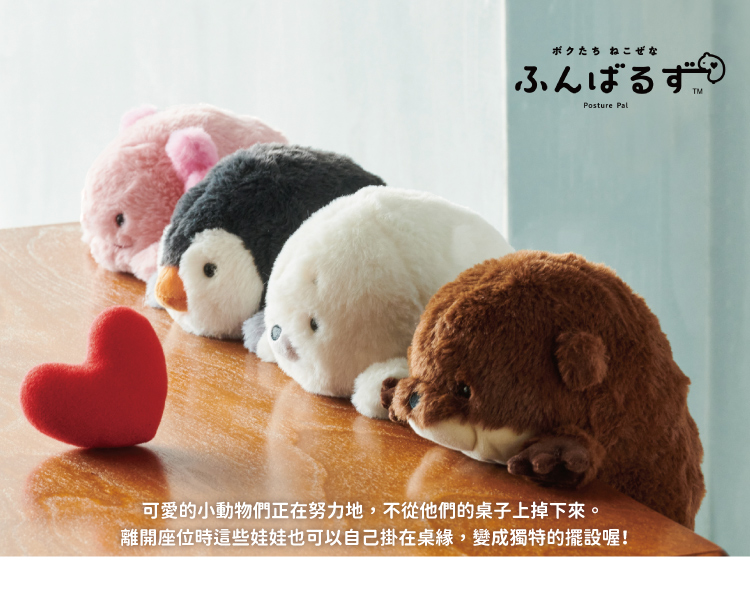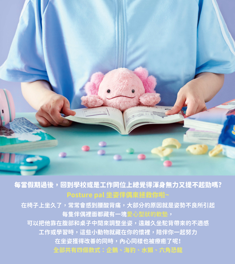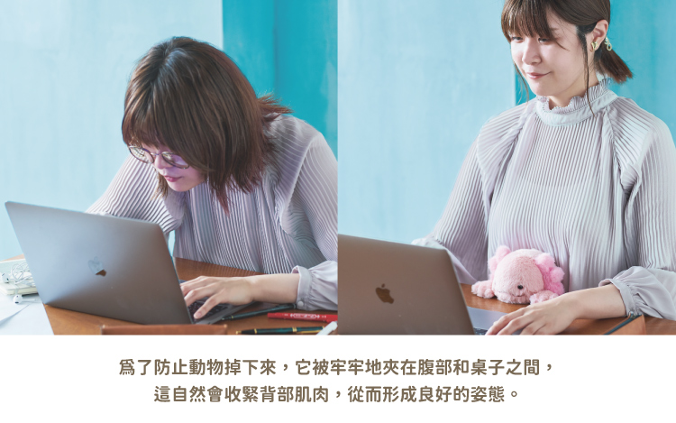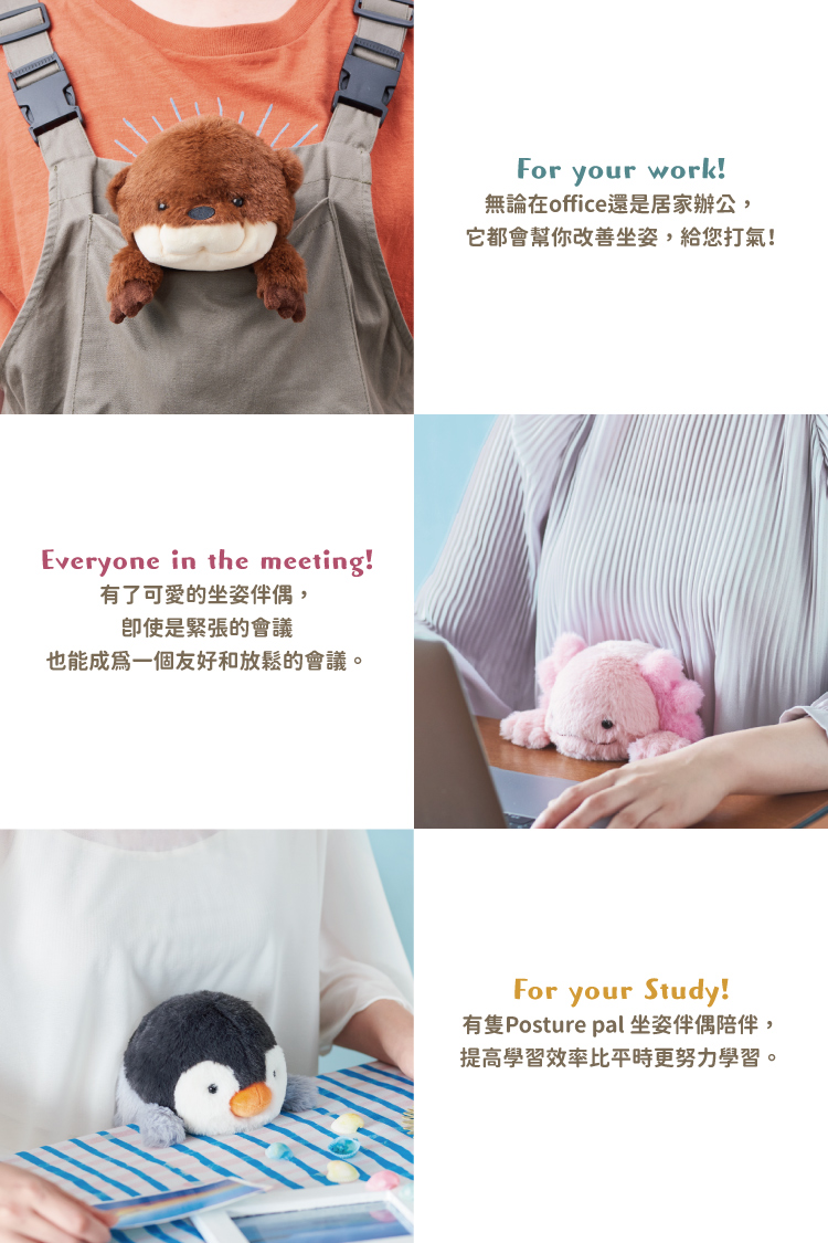 在椅子上坐久了,常常會感到腰酸背痛,大部分的原因就是姿勢不良所引起每隻伴偶裡面都藏有一塊愛心型狀的軟墊,可以把他靠在腹部和桌子中間來調整坐姿,遠離久坐駝背帶來的不適感工作或學習時,這些小動物就藏在你的懷裡,陪伴你一起努力在坐姿獲得改善的同時,內心同樣也被療癒了呢!