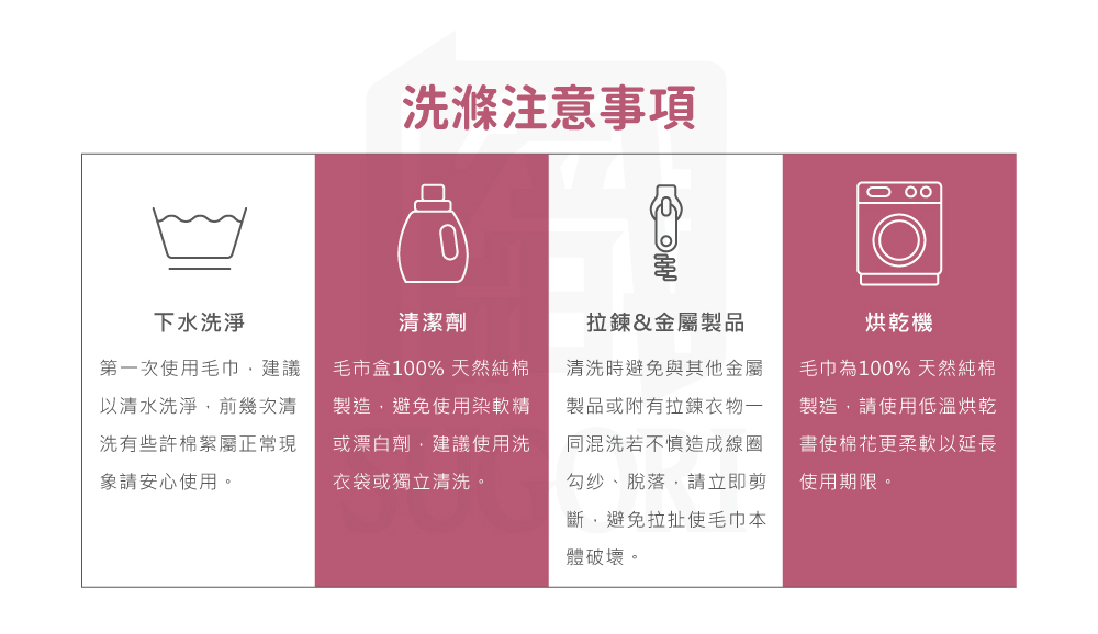 【洗滌注意事項】1.請套用洗衣袋清洗,使用洗衣機建議選用柔軟/毛巾織品特定洗衣程序,或以低轉速模式進行洗滌,以免破壞織品纖維構造,避免浸泡過長,以免掉色或互相染色。2.必要時少量加入洗滌劑,請勿使用漂白劑、含螢光成分等洗衣精,以免破懷織品色澤、纖維等,水溫不超過40度。3.請勿使用高溫烘乾,或以熨斗整燙,避免纖維受到破壞。