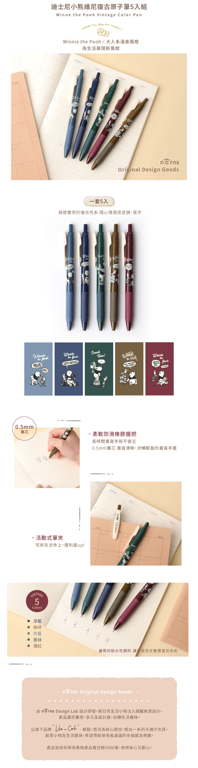 【Norns】迪士尼小熊維尼復古原子筆5入組- Norns Original Design Disney正版授權文具 彩色復古色鋼珠筆(每款式最少需購買2件) | NearMe | 線上送禮平台『獨家支援 收禮者改選禮物』