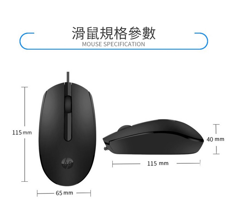 規格表品牌:HP型號:M10連接方式:有線USBDPI:1200按鍵數:3按鍵力道:75±20gf線長:1.0 ± 0.05m操作系統:Win7/8/10尺寸 (mm):115(L) x 65(W) x 40(H) 毫米保固:有限保固一年商品核准字號:R3E652