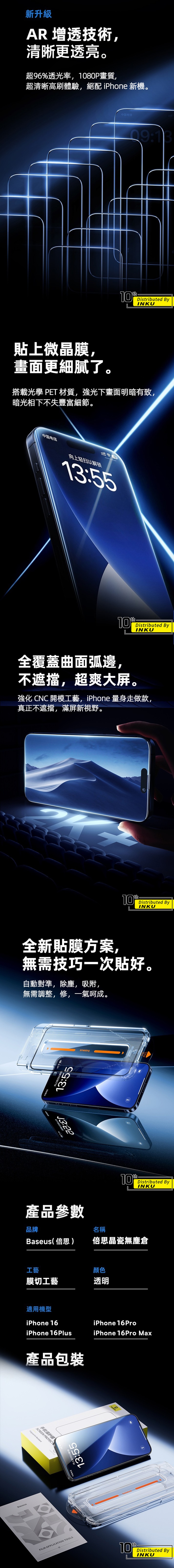 ---------------------------------------------------------------------------產品參數品牌:Baseus(倍思)名稱:倍思晶瓷無塵倉工藝:膜切工藝顏色:透明適用機型:i16 Pro / i16 Pro Max