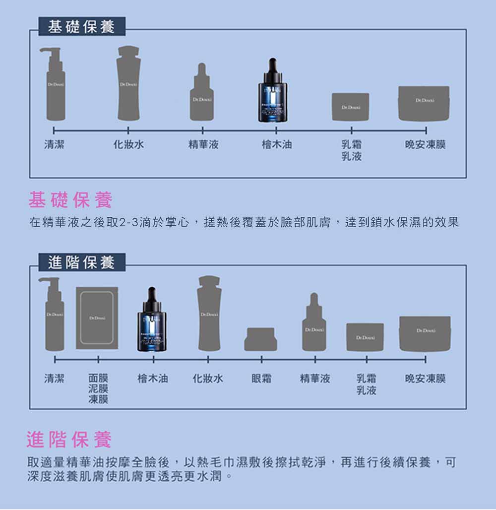 封存,一擦即透,層層舒緩肌膚壓力,給予肌膚輕油的照顧,添加檜木精華延緩肌膚老化現象,調節皮脂深入供給肌膚所需。□依照不同膚質選擇適合的使用方式□【乾性膚質/混合性肌膚】建議您可以將精華油滴在你覺得保濕力不足的產品中(乳液/乳霜)使用, 或是在保濕精華後使用檜木油按壓吸收,再使用乳霜封存營養。【油性膚質】可以在化粧水後取適量按摩臉部,再以溫熱毛巾敷於全臉,最後毛巾沾水擰乾後再擦全臉,接著進行一般保養程序化妝水>精華液>乳霜。