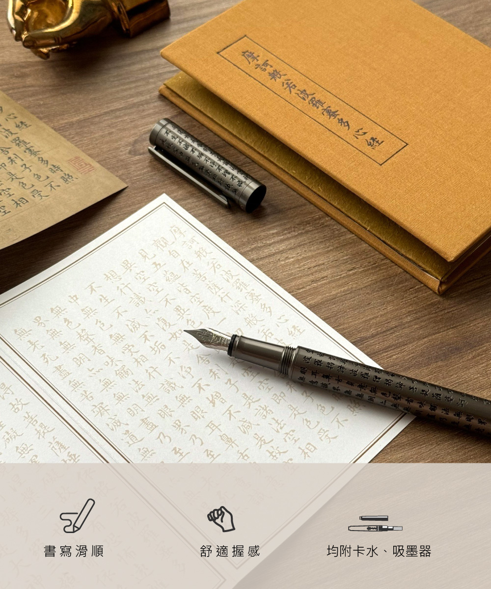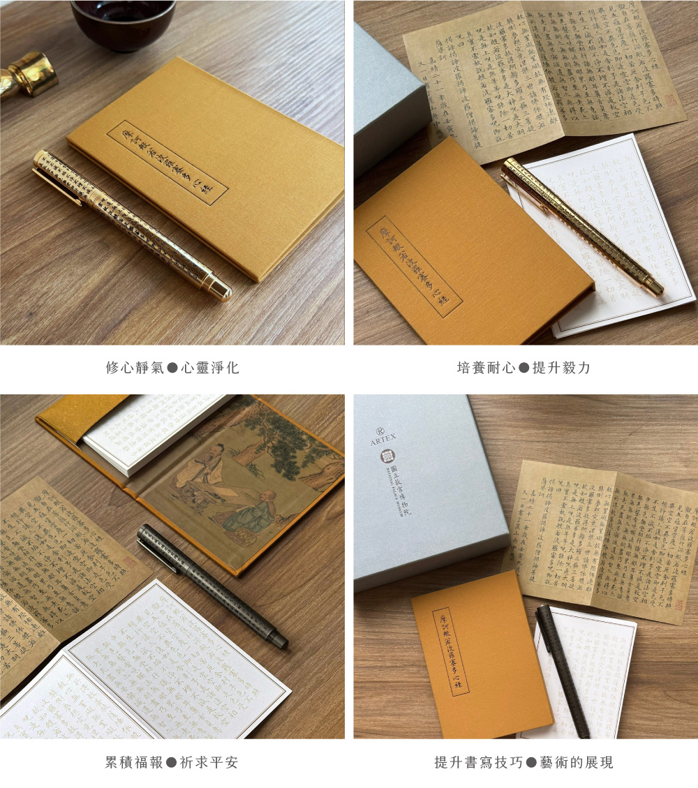 商品還含整套的心經專用筆及抄寫收納本,讓您在每一筆每一畫中感受古今交融的靜心力量,感受到身心的平衡與安定,開啟一段修身養性的心靈之旅。