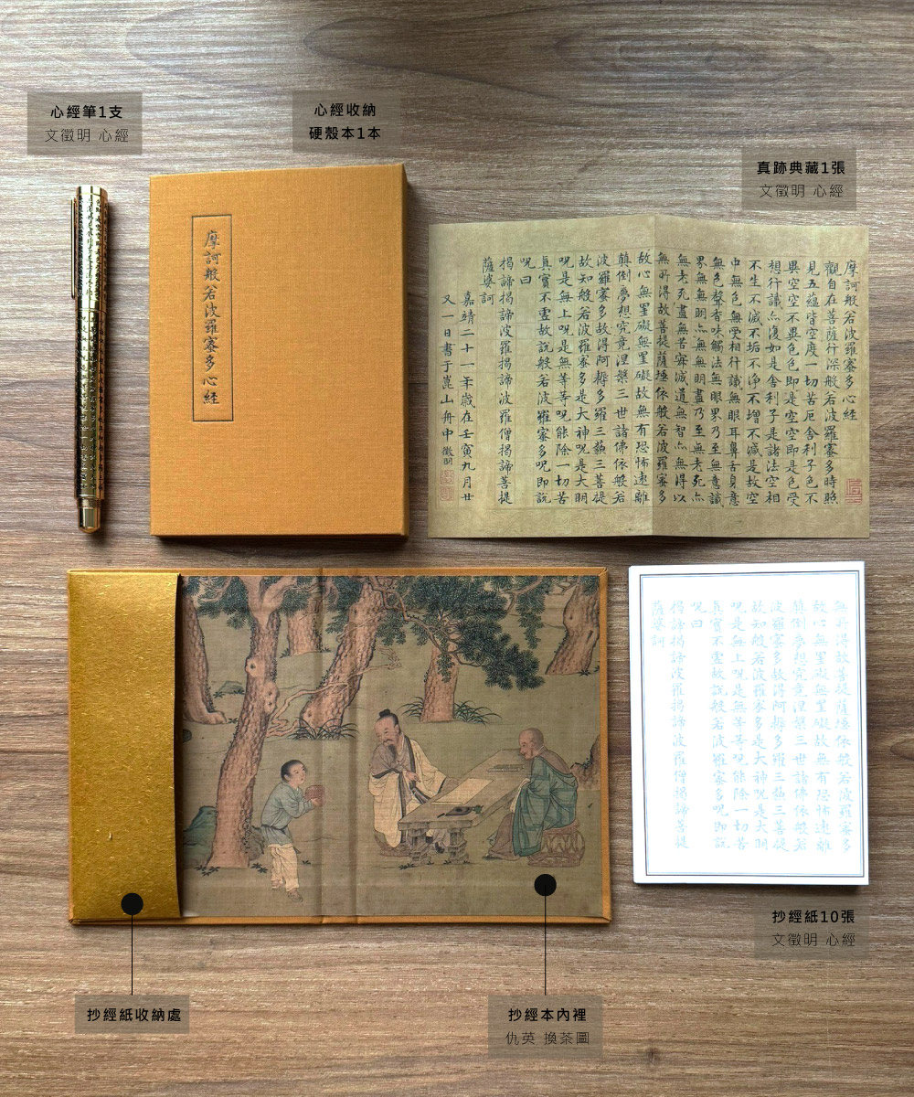 本套禮盒以明代書法大師文徵明的書法真跡為臨摹範本,完美結合傳統與現代的抄經藝術。