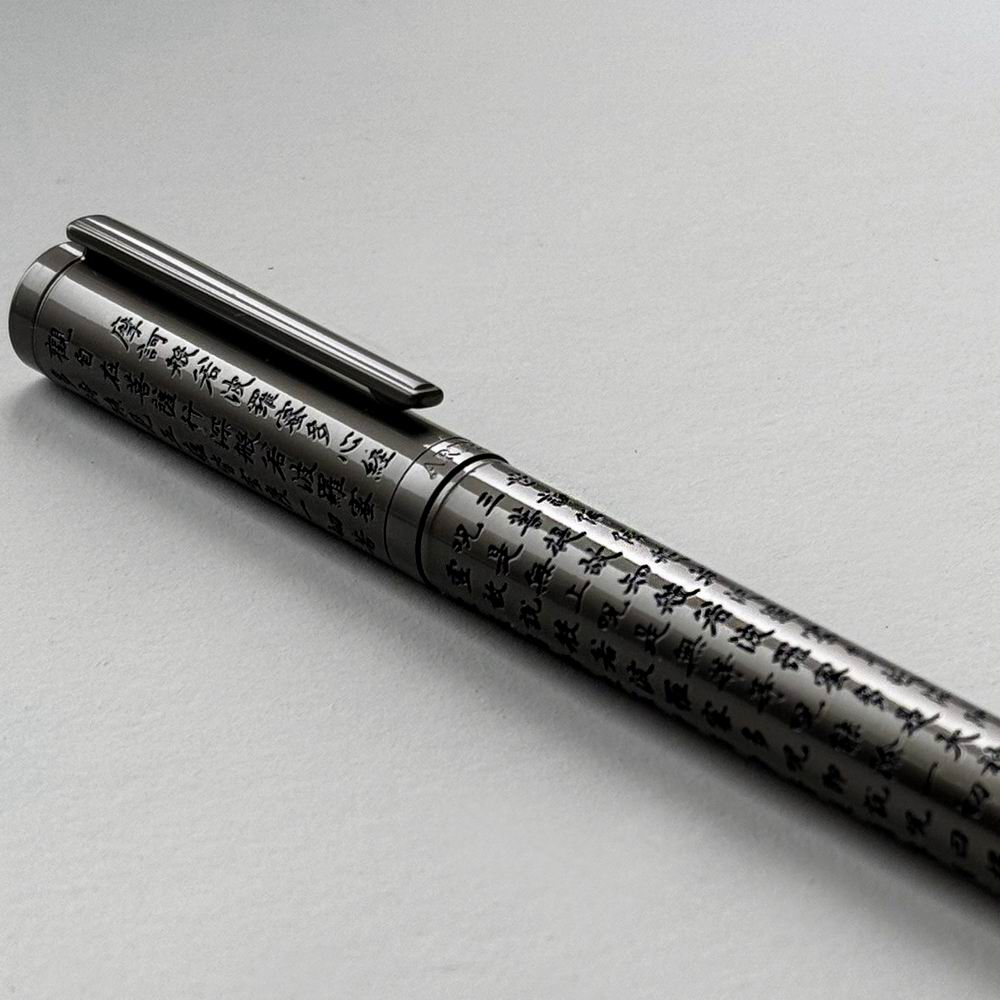 筆身上佈滿的心經全文,正是以蝕刻工藝巧妙呈現。蝕刻工藝作為一種精密技術,利用化學反應在金屬表面雕刻出精緻的文字圖案。筆身先覆上一層耐蝕保護層,然後以雕刻的方式創造出心經文字的版面設計。裸露的部分隨後進入酸性溶液,進行精確的蝕刻處理。通過精心控制的深淺與細節,每個字都被賦予立體且細膩的質感,展現出工藝與文化的完美融合。