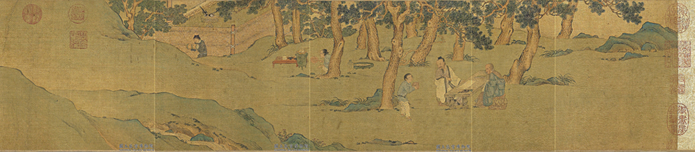 此圖乃崑山周于舜請文徵明書心經,並請仇英補圖,繪趙孟頫書心經以換茶之情事。