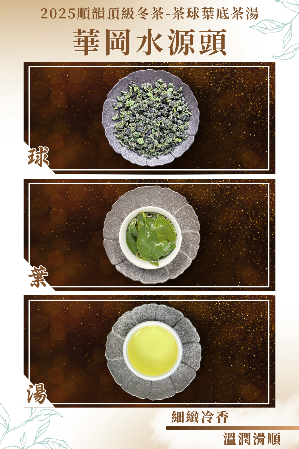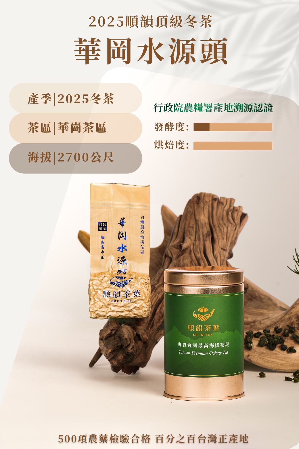 現今台灣最高茶園種植,坐落於華岡海拔2700公尺的原始森林中絕佳的茶菁+順韻精密的製茶技術=絕妙好茶