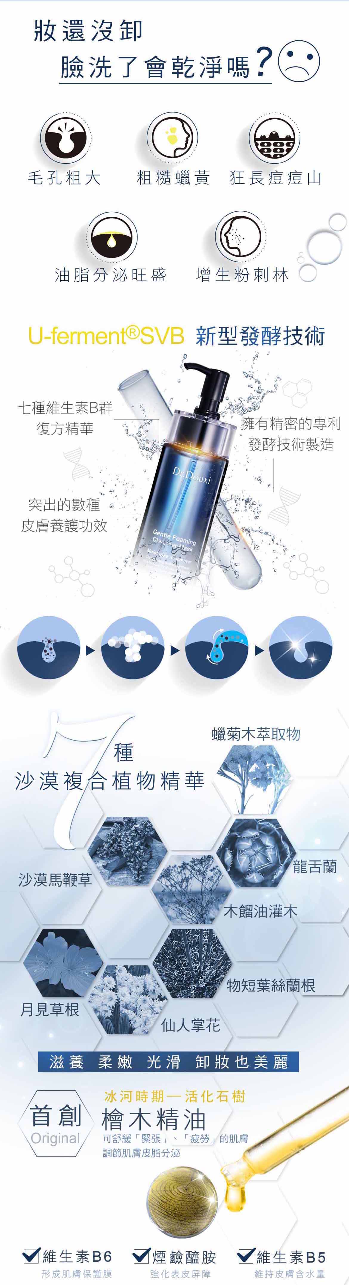 U-ferment®SVB新型發酵專利,洗卸合一溫和卸除底妝髒污,並同時帶走肌膚多餘油脂污垢,在洗卸同時還能養護肌膚,給肌膚最好的照顧。別於一般傳統洗臉泡沫,製造泡沫過程不需利用水分,而是推開洗卸凝膠時,透過接觸和注入氧氣將其形成能夠清除臉部污垢的泡沫。乾洗(卸妝): 臉部和手部保持乾燥的狀態,在手心處滴3-5滴,待臉上充滿含氧泡泡,微微沾上清水,按摩輕柔30秒左右後清水沖洗。濕洗(洗臉): 臉部和手部水打濕,手掌處滴3-5滴,雙手打出泡沫後正常清潔臉部即可。