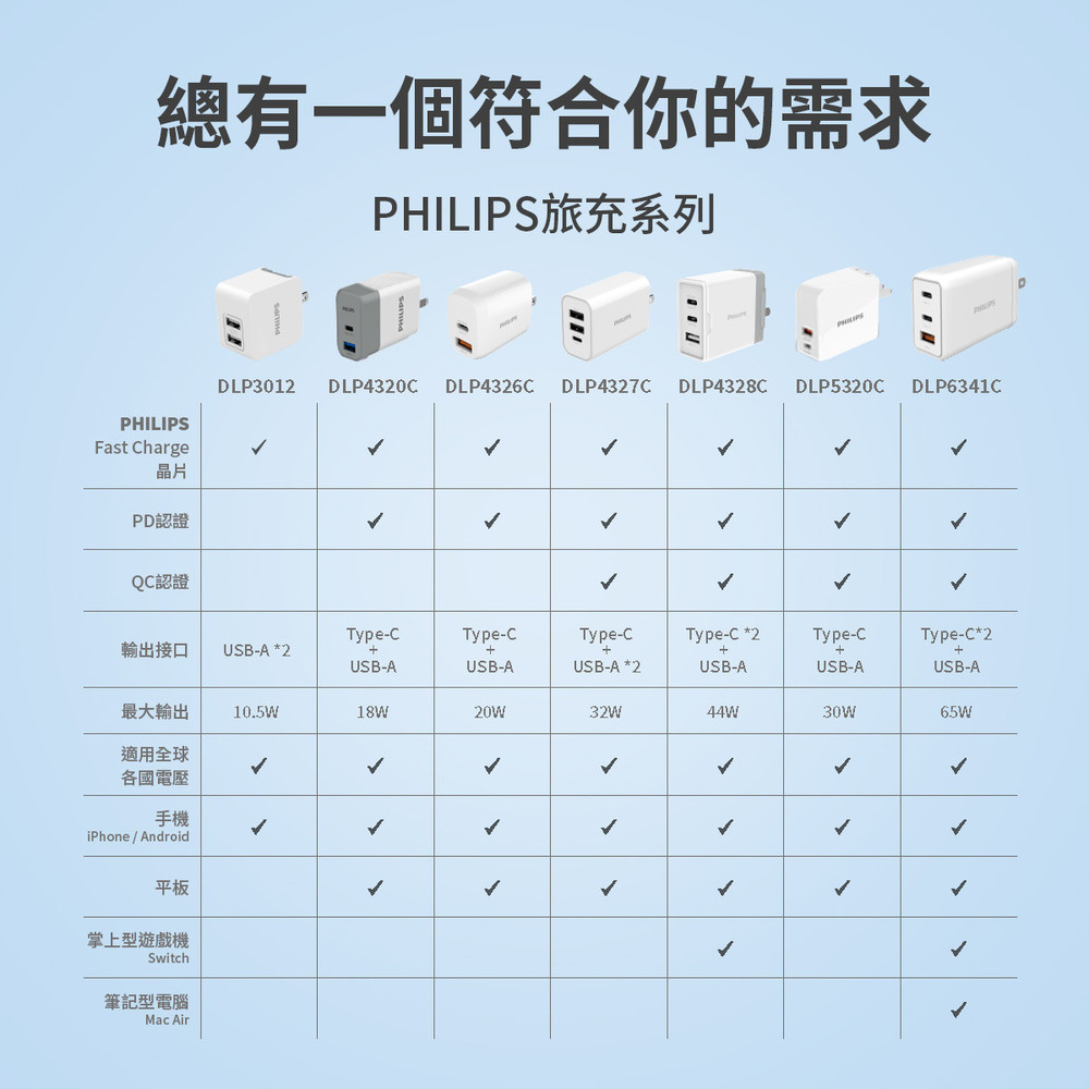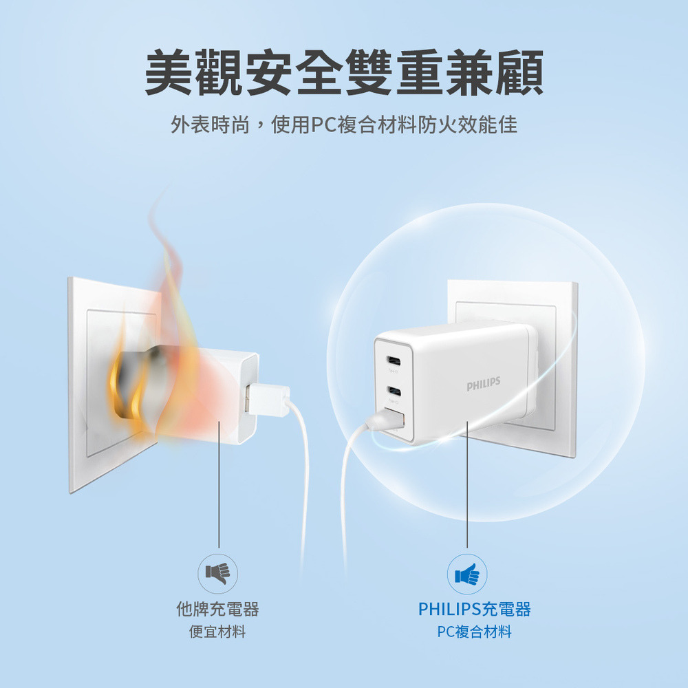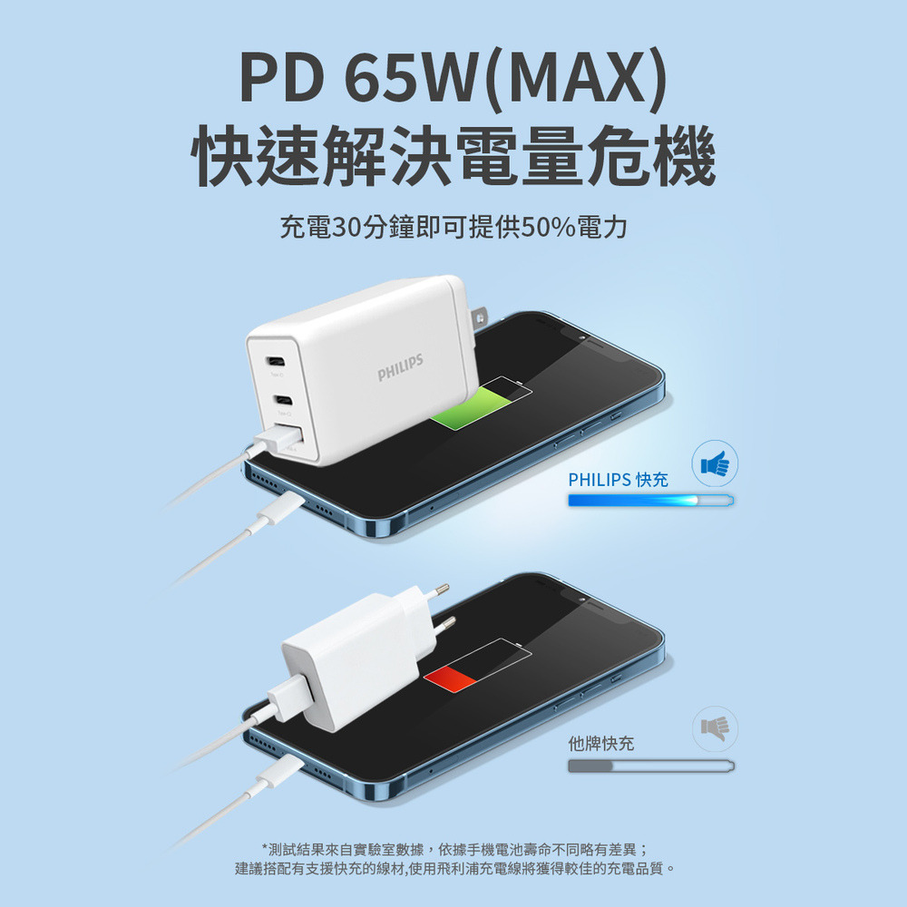 Philips 飛利浦 65W GaN氮化鎵 TypeC USB PD/QC 3孔 快充充電器(DLP6341C)額定輸入:AC 100-240V~50/60Hz 1.5A(MAX)額定輸出:Type-C1:5V 3A, 9V 3A, 12V 3A, 15V 3A, 20V 3.25A(Max.:65W)Type-C2:5V 3A, 9V 3A, 12V 3A, 15V 3A, 20V 3.25A(Max.:65W)USB-A:5V 3A,9V 3A,12V 2.5A,20V 1.5A(Max.:30W)組合輸出:Type-C1+Type-C2:45W+18W(Max.:63W)Type-C1+USB-A:45W+18W (Max: 63W)Type-C2+USB-A:5V 3A(Max.:15W)Type-C1+Type-C2+USB-A:60W(Max)商檢字號:R39017
