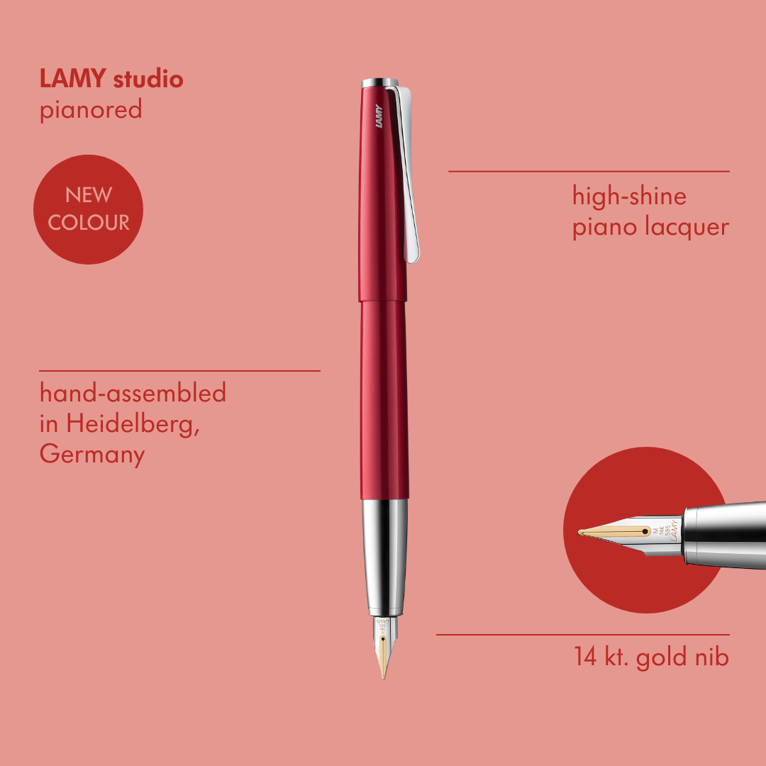 2024奢華色彩莫過於高貴典雅皇家紅色與鋼琴紅色,為LAMY studio系列增添一種復古高級時尚感;近年復古流行,以復古風為主的系列商品都以典雅紅為主色調,比如日系風格的輕珠寶系列、經典品牌的包袋類,或是時尚流行運動品牌等等。透過典雅皇家紅色與鋼琴紅色,將復古元素與現代風格銜接,配襯出經典的輕奢華古典紅。