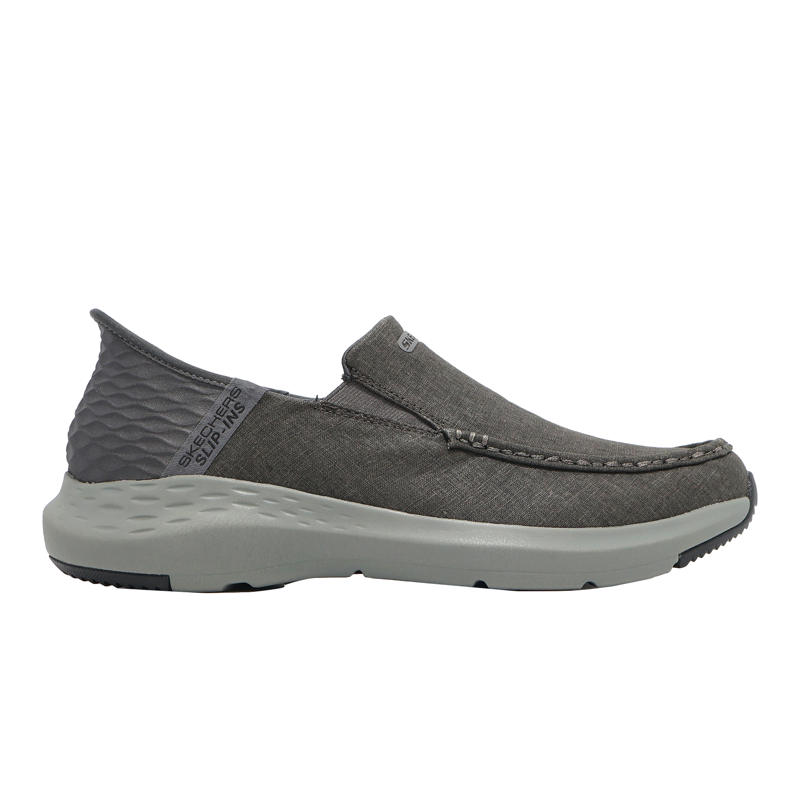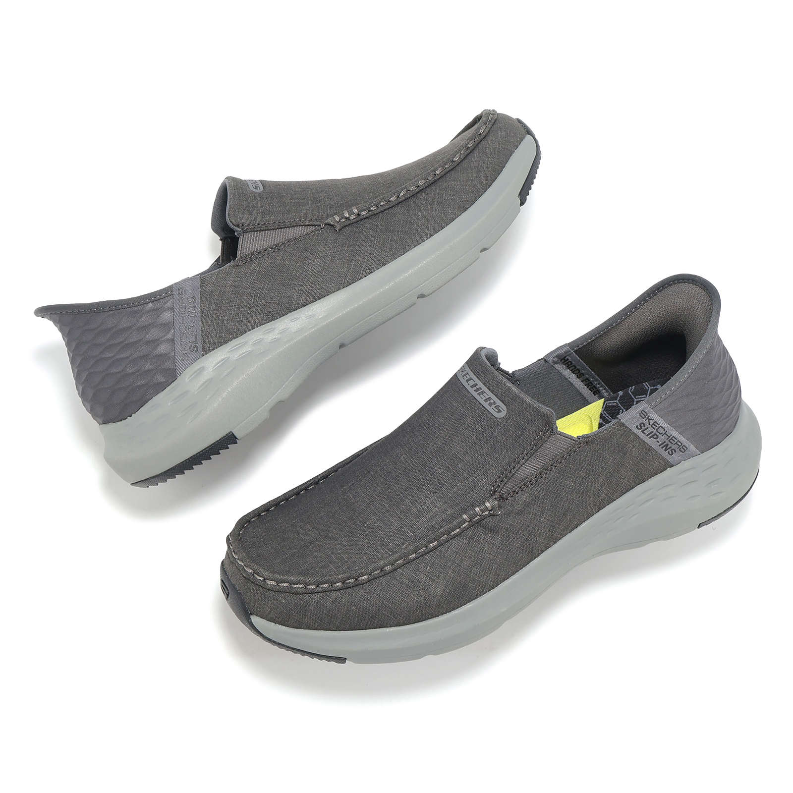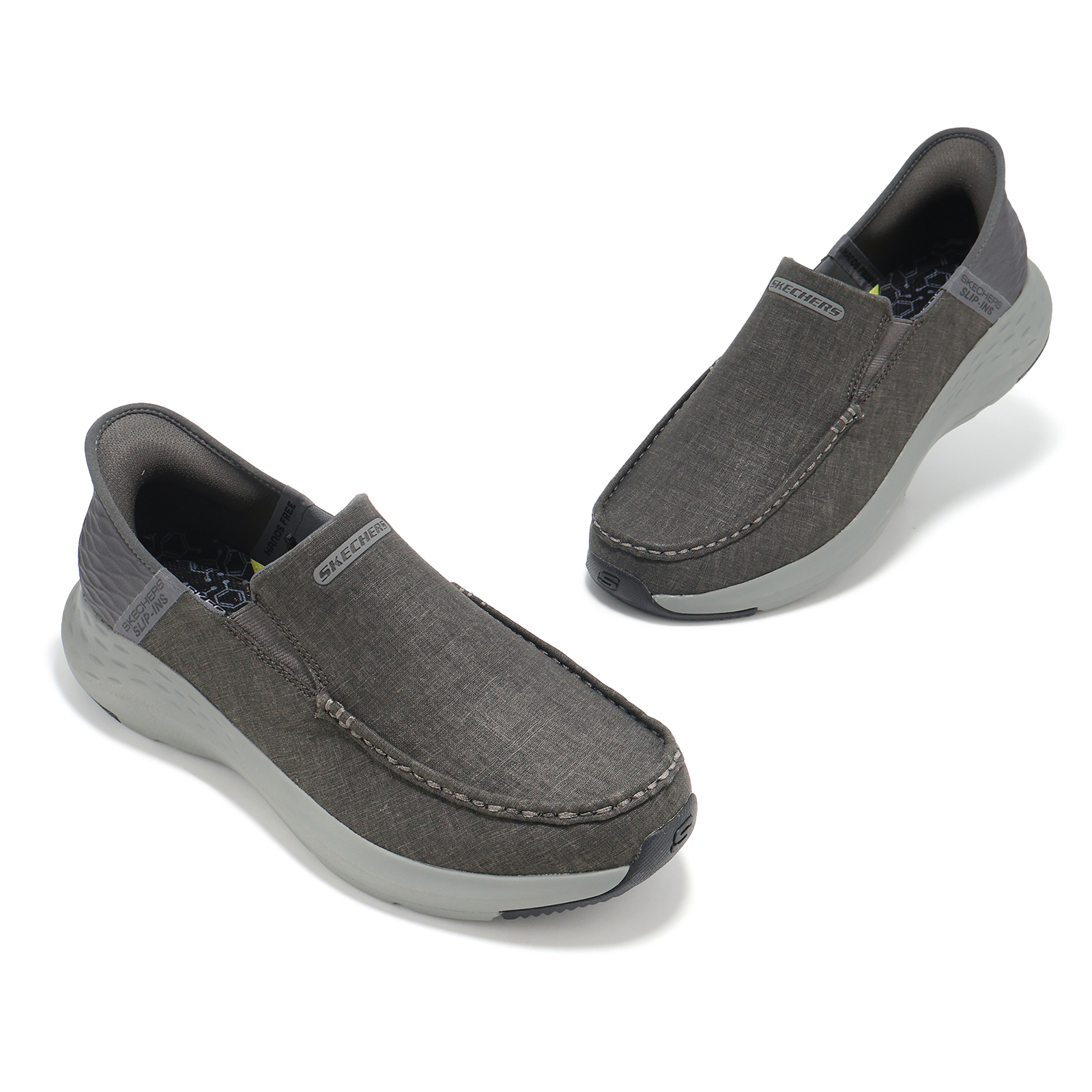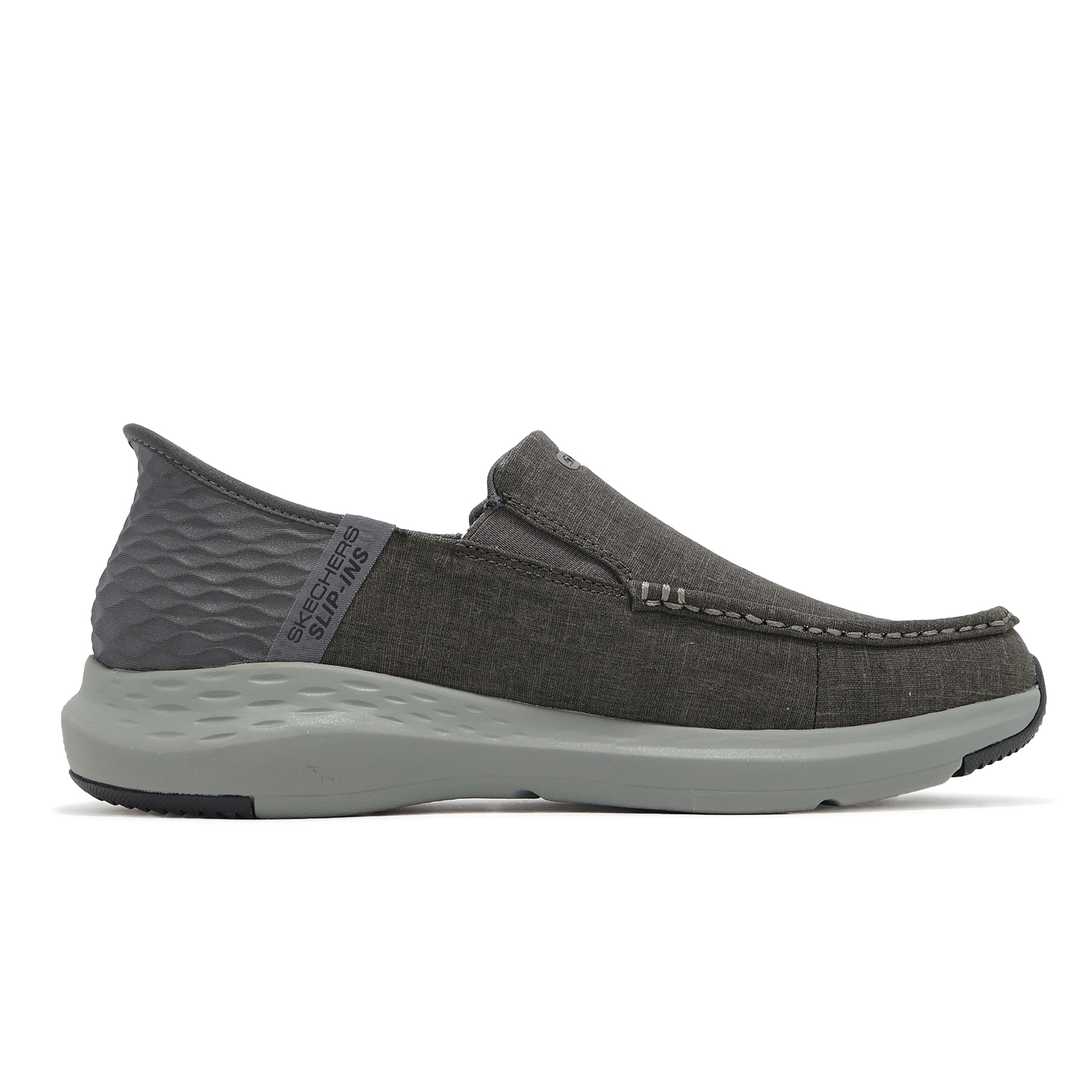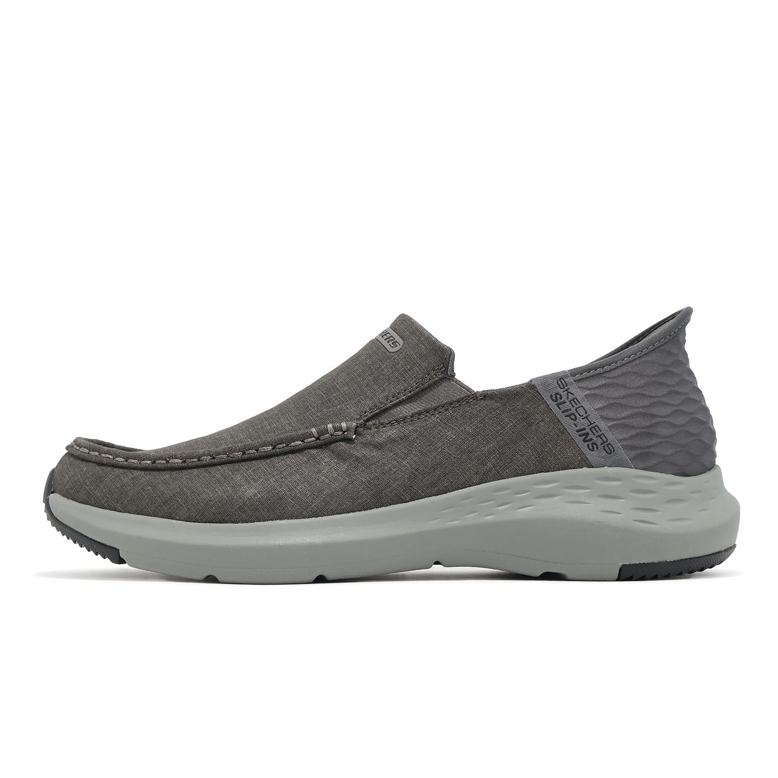品牌: SKECHERS型號: 205192-GYBK品名: Parson-Faustino Slip-Ins版型: 版型正常* 鞋面採用帆布設計及後跟快穿 Heel Pillow 設計,透氣又方便穿脫。