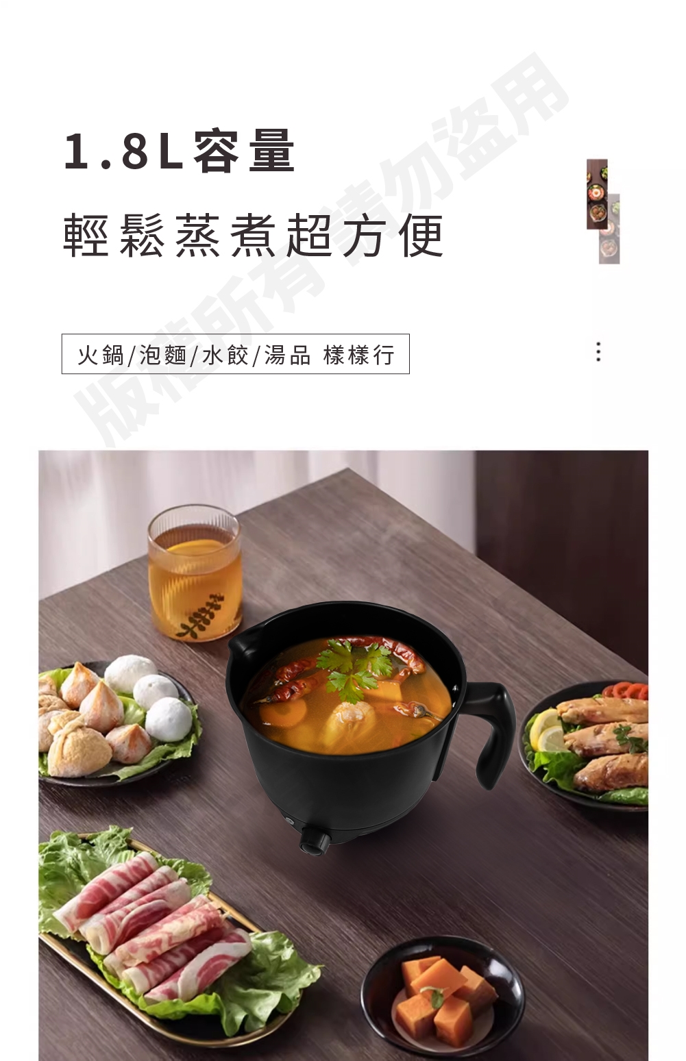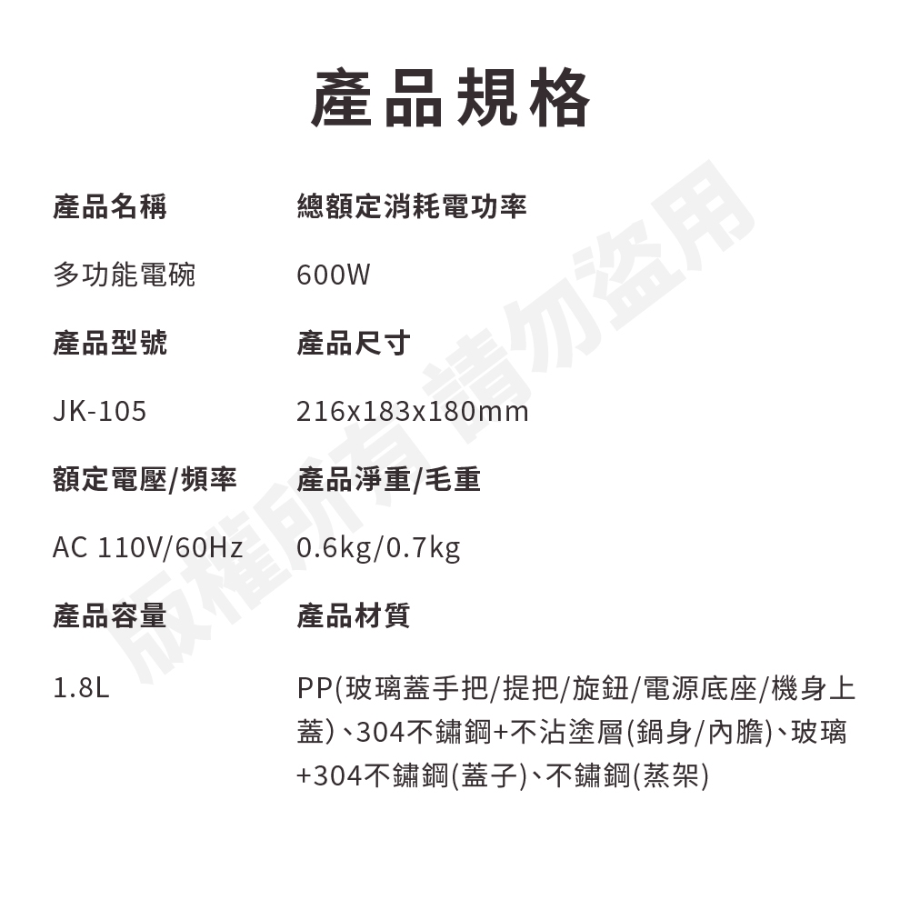 ‧ 304不鏽鋼+不沾內鍋‧ 鳥嘴設計,方便不外漏‧ 1.8L容量,輕鬆蒸煮超方便‧ 採用分離式設計,清洗更方便‧ 透明可視玻璃設計,輕鬆掌握蒸煮狀況※鍋身為304不鏽鋼,使用過程中可能會出現輕微的刮傷,這是材質特性所致,屬於正常現象。