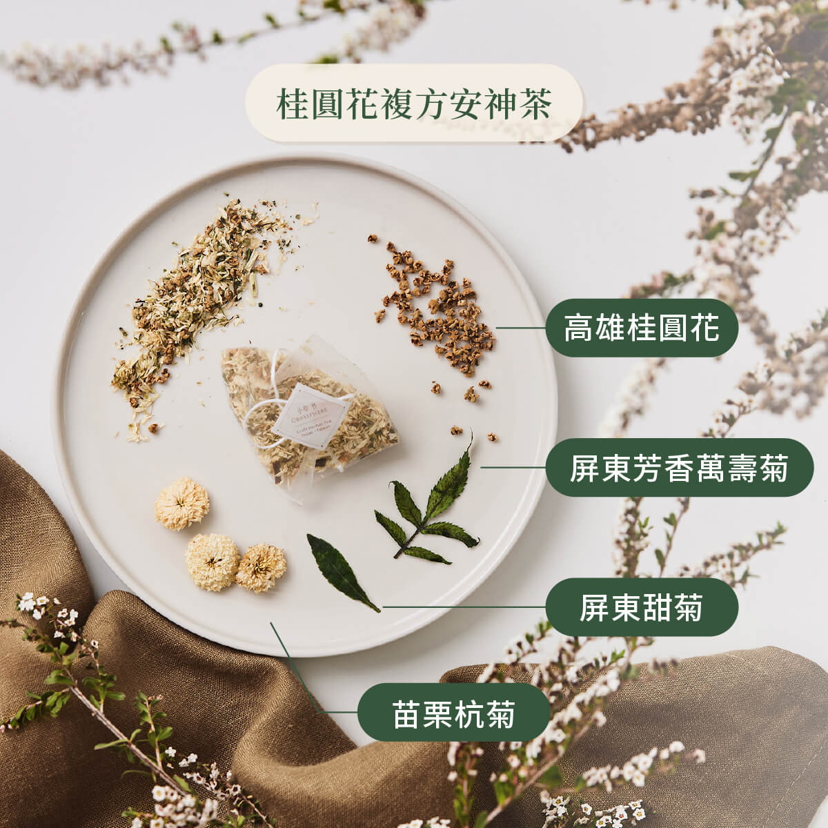 以桂花為基底的複方花草茶桂花、杭菊、甜菊、檸檬草花草流淌清甜與滋潤,有如一抹暖陽無咖啡因配方,晚上睡前也能放心喝小草作 無咖啡因 桂圓花複方安神茶舒緩放鬆,安定情緒以桂圓花為基底的複方花草茶桂圓花、甜菊、杭菊、芳香萬壽菊桂圓花與杭菊,帶出蜜糖般的熱帶水果香氣無咖啡因配方,睡前飲用,舒緩身心