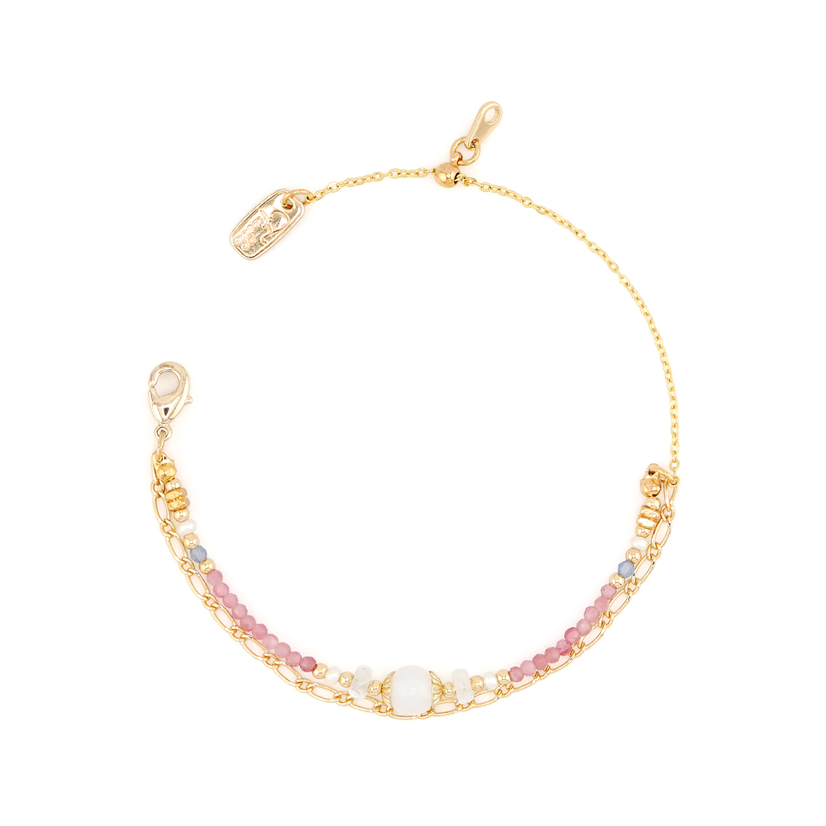 – 商品材質 Product Materials –蛋白石、粉碧璽、白水晶、淡水珍珠、托帕石、黃銅鍍18K金– 寶石寓意 Gemstone Fortunes –蛋白石 Opal:又稱歐泊,象徵幸福與希望,被認為能引出內在美與才能。碧璽 Tourmaline:為多彩的寶石,有助於激發創意,帶來無限靈感;具有吸引愛情及友誼的能量。