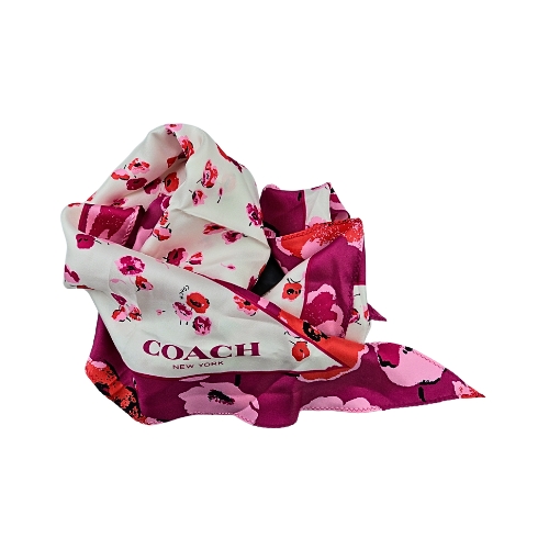 COACH造型領巾,採用100%純絲質,觸感柔軟舒適,三色花朵搭配圖紋鮮明好搭,可當領巾、髮帶,亦適合在早晚偏涼的換季之際隨身攜帶保暖。