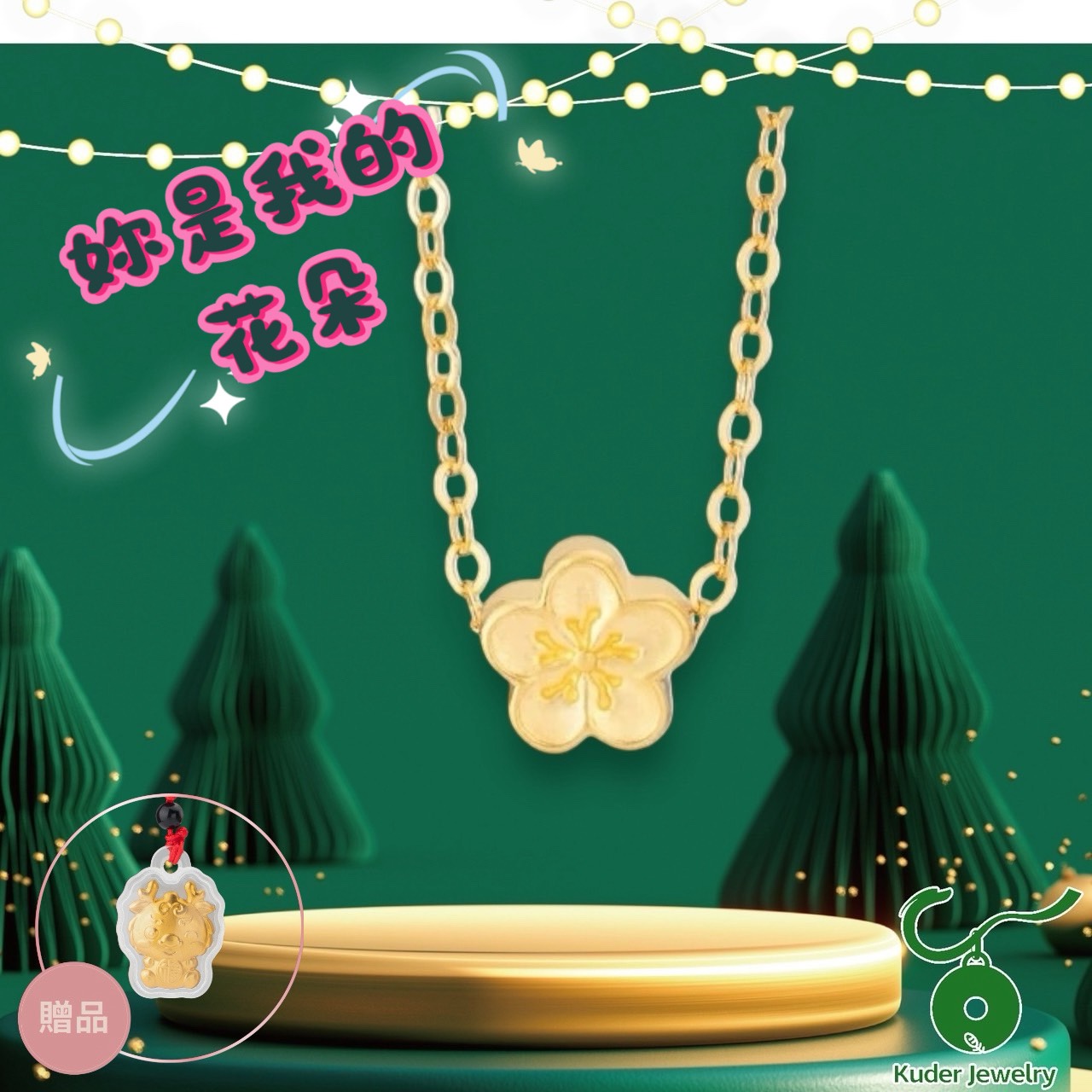 商品內容名稱: Kuder Jewelry黃金上身富貴加分~小花朵黃金項鍊,買1送1贈小金龍項鍊貨號: KD024G32