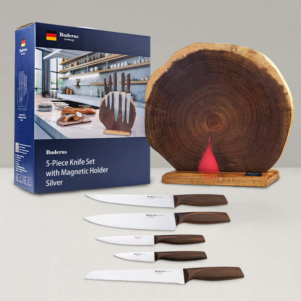 品名:原生態系到_磁吸廚刀6件組-年輪版產品內容 : 磁吸刀架/主廚刀/切肉刀 / 麵包刀/蔬果刀/萬用刀包裝尺寸:29cm X 10.5cm X 34cm 重量:約2.5公斤材質 : 天然相思木/特殊刃鋼適用 : 一般家用廚刀*產品符合FCS永續森林認證MADE IN CHINA