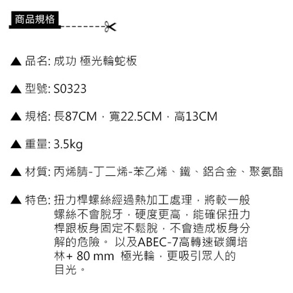 型號:S0323顏色:黃色 / 藍色 / 黑色規格:長87cm,寬22.5cm,高13cm重量:3.5kg耐重:95kg材質:板身:丙 烯腈-丁二烯-苯乙烯、鐵輪座:鋁合金輪子:高彈性PU