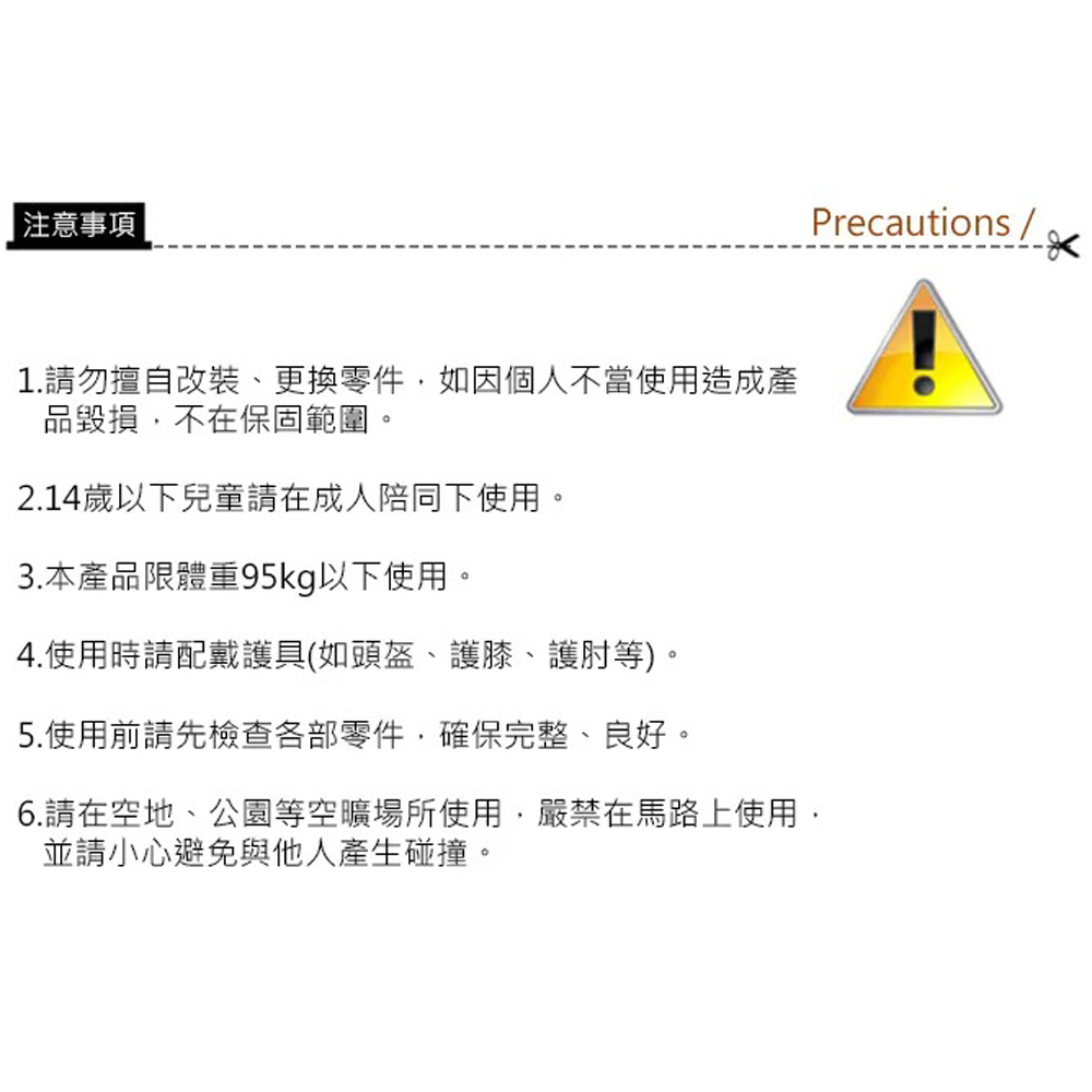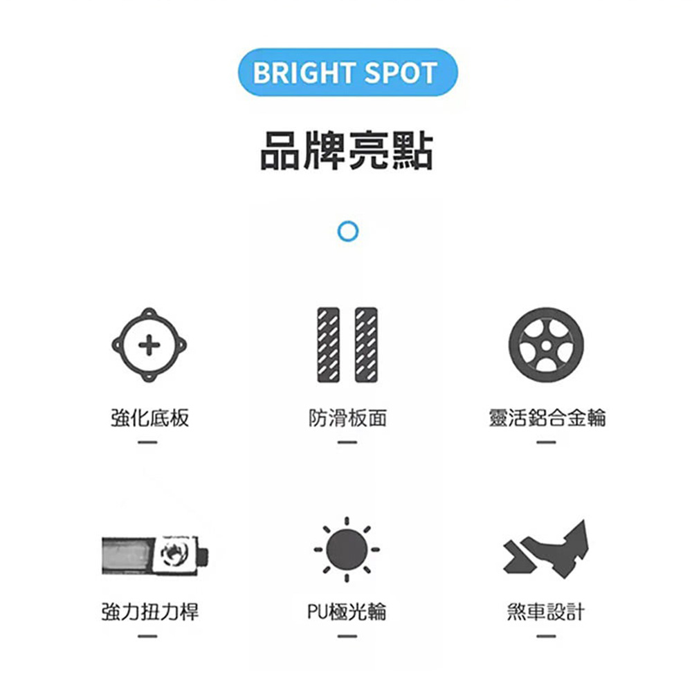1、鋁合金輪座強化電鍍鋁合金輪座,安全不斷裂,搭配加大培林組,板身擺動更順暢,溜行續航力更持久。2、扭力桿螺絲扭力桿螺絲經過熱加工處理,確保扭力桿跟板身固定不鬆脫,使用更安全強化ABS板身板身採用強化ABS材質(全新原料),相較一般市面低價品採用回收料,更加堅固安全,可耐重95kg。3、極光PU輪最新研發極光PU輪,亮度比一般發光輪更亮強化扭力桿兩側的強化鋁合金套件,可完全固定扭力桿,結構更堅固,溜行轉向更平穩、順暢。