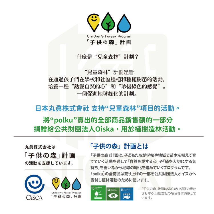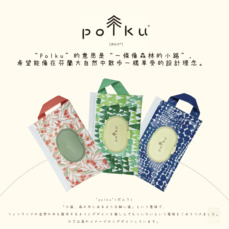 1.花色繽紛可愛以芬蘭風自然風景插圖為主2.“Polku”的意思是“一條像森林的小路”,希望能像在芬蘭大自然中散步一樣享受的設計理念。 3.可將濕紙巾放入袋中,想使用時可以隨時快速取出4.背後附有可拆卸提把,可以自由掛在需要的地方5.日本丸真株式會社 支持“兒童森林”項目的活動。將“polku”賣出的全部商品銷售額的一部分捐贈給公共財團法人Oiska,用於植樹造林活動。