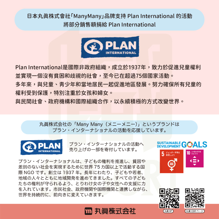 1.可將濕紙巾放入袋中,想使用時可以隨時快速取出2.背後附有可拆卸提把,可以自由掛在需要的地方3.日本丸真株式會社「ManyMany」品牌支持 Plan International 的活動,將部分銷售額捐給 Plan International