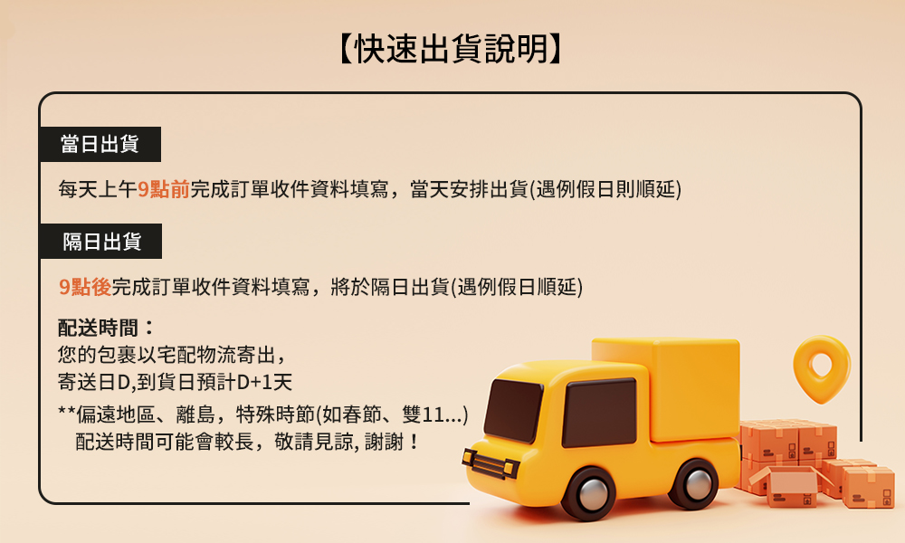 完成付款後會儘速使用本公司配合的物流寄出,出貨時間3~5日工作天(不含例假日)。實際配送時間依物流公司為主。