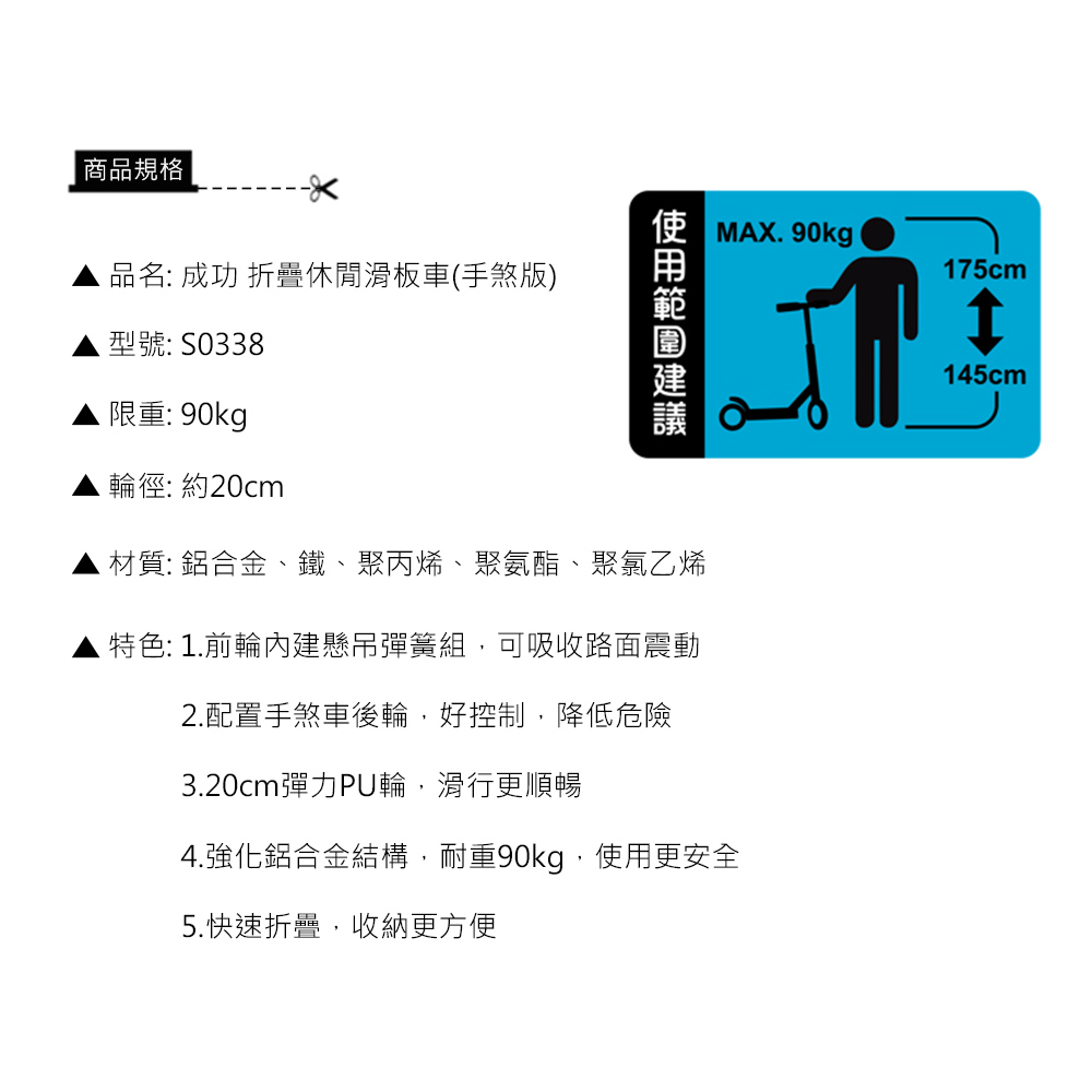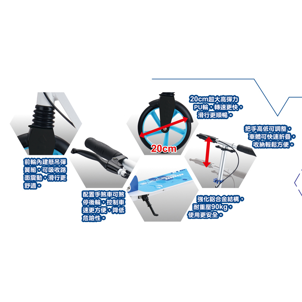 1,前輪內建懸吊彈簧組,可吸收路面震動2.配置手煞車後輪,好控制,降低危險3.20cm彈力PU輪,滑行更順暢4.強化鋁合金結構,耐重90kg,使用更安全5.快速折疊,收納更方便