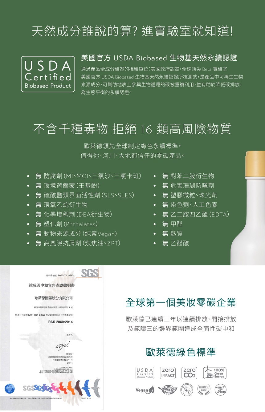 這是一款地球友善洗髮精榮獲美國官方USDA Biobased生物基天然永續認證純素、無膚質、拒絕動物實驗,不添加8種有害物質秉持天然配方與綠色永續,與大自然共鳴共生。