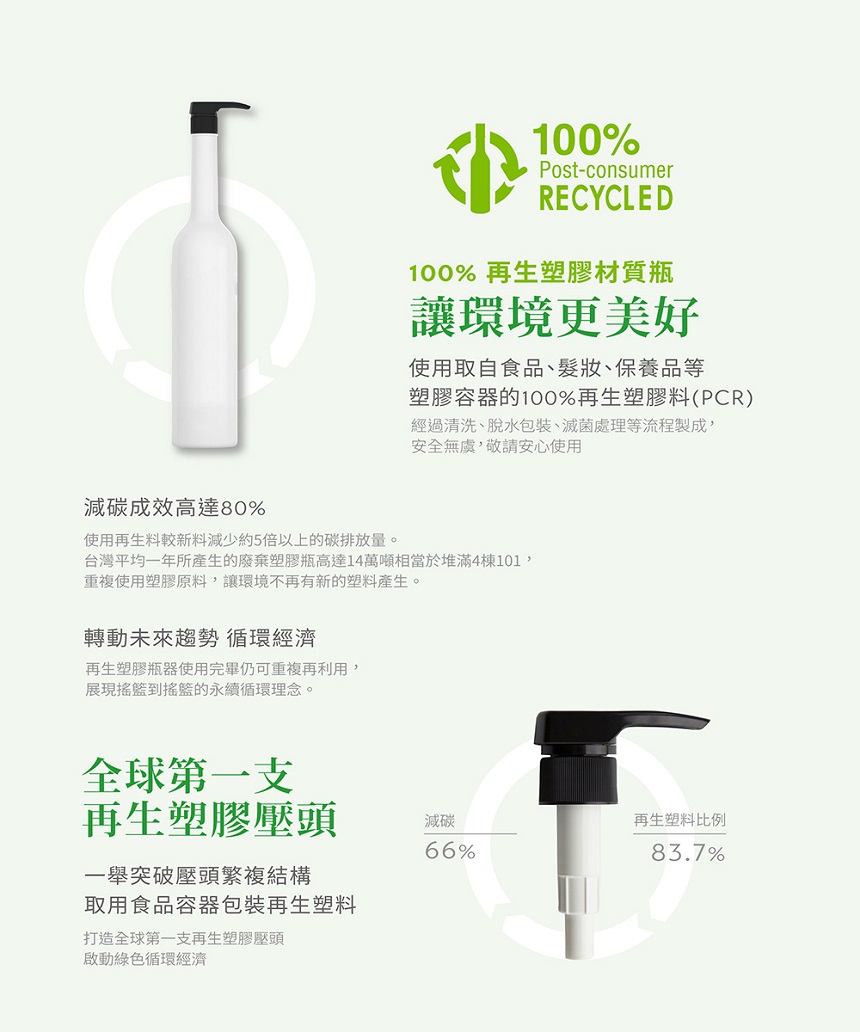 【環保小叮嚀】 1.使用歐盟有機組織天然驗證起泡成分,更健康更環保。2.瓶身為100%再生塑膠料(PCR)製成,重複使用塑膠原料,不再產生新塑膠廢棄物。