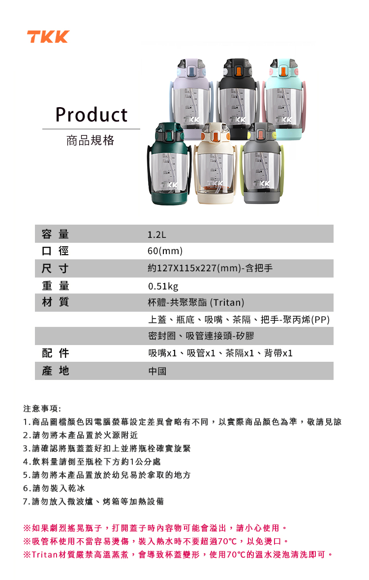 刻度容量:0.9(L)滿容量:1.2(L)口徑:約60(mm)商品尺寸:約127x115x227(mm)-含把手包裝尺寸:約113.5x113.5x233(mm)重量:本體約0.51(kg)、含包裝約0.58(kg)Tritan耐溫:-20~100度材質:杯體-共聚聚酯 (Tritan) 上蓋、瓶底、吸嘴、茶隔、把手-聚丙烯(PP) 密封圈、吸管連接頭-矽膠配件:吸嘴x1、吸管x1、茶隔x1、背帶x1產地:中國