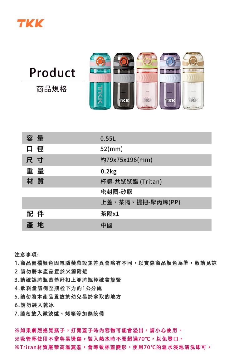 刻度容量:0.5(L) 滿杯容量:0.55(L)口徑:約52(mm)商品尺寸:約79x75x196(mm) 包裝尺寸:約75x75x196(mm)重量:本體約0.2(kg)、含包裝約0.23(kg)Tritan耐溫:-20~100度材質:杯體-共聚聚酯 (Tritan) 密封圈-矽膠 上蓋、茶隔、提把-聚丙烯(PP)配件:茶隔x1產地:中國