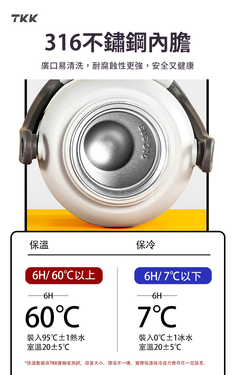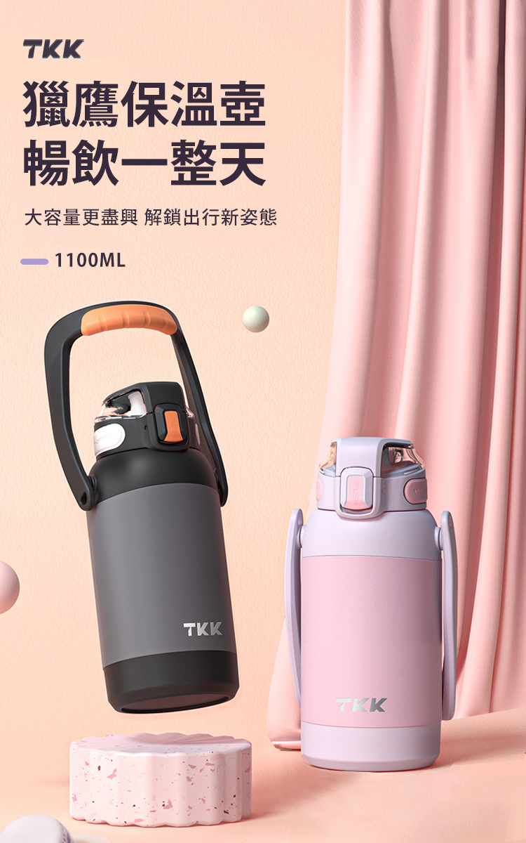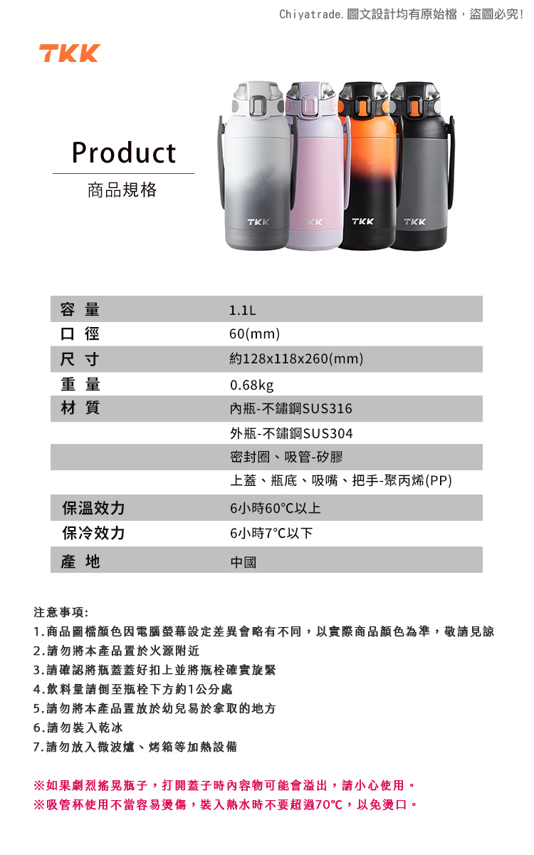 容量:1.1(L)口徑:約60(mm)商品尺寸:約128x118x260(mm) 包裝尺寸:約117x115x307(mm)重量:本體約0.68(kg)、含包裝約0.89(kg)材質:內瓶-不鏽鋼 SUS316 外瓶-不鏽鋼SUS304 密封圈、吸管-矽膠 上蓋、瓶底、吸嘴、把手-聚丙烯(PP)配件:吸嘴x1、吸管x1、背帶x1保溫效力:6小時60℃以上保冷效力:6小時7℃以下產地:中國