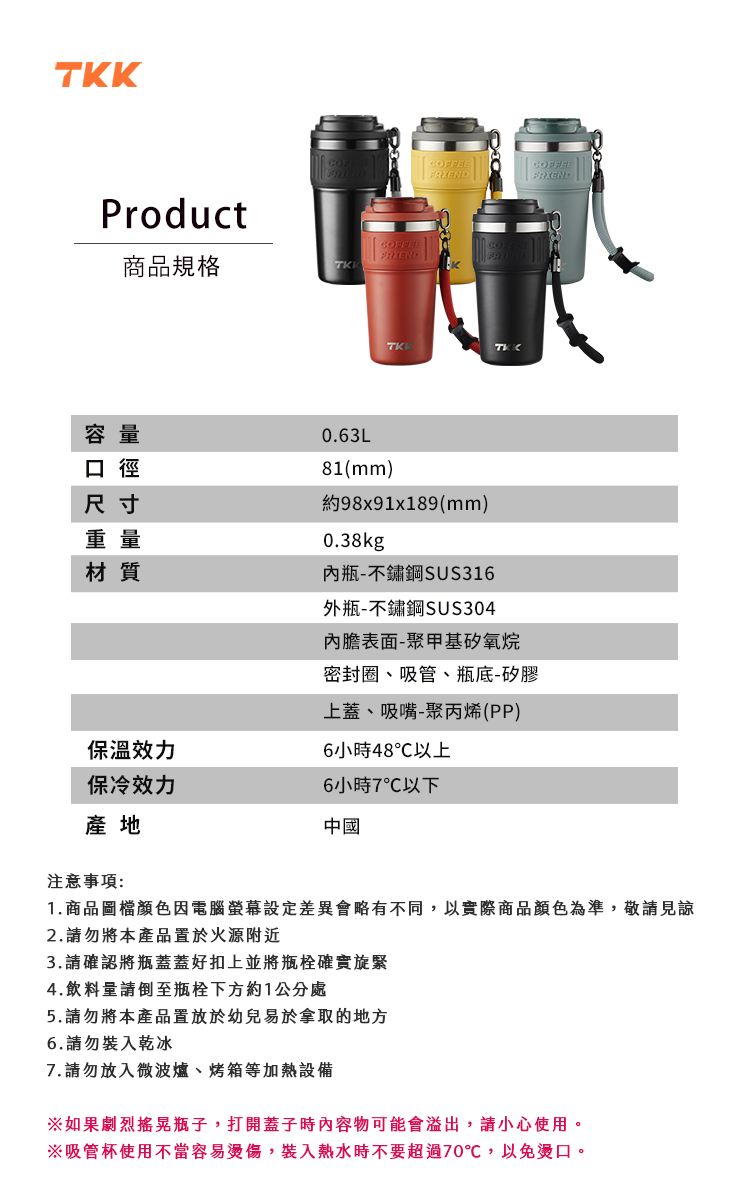 容量:0.63(L)口徑:約81(mm)商品尺寸:約98x91x189(mm) 包裝尺寸:約92.5x92.5x219(mm)重量:本體約0.38(kg)、含包裝約0.48(kg)材質:內瓶-不鏽鋼 SUS316 外瓶-不鏽鋼SUS304 內膽表面-聚甲基矽氧烷 密封圈、吸管、瓶底-矽膠 上蓋、吸嘴-聚丙烯(PP)配件:提帶x1、吸管x1保溫效力:6小時48℃以上保冷效力:6小時7℃以下產地:中國