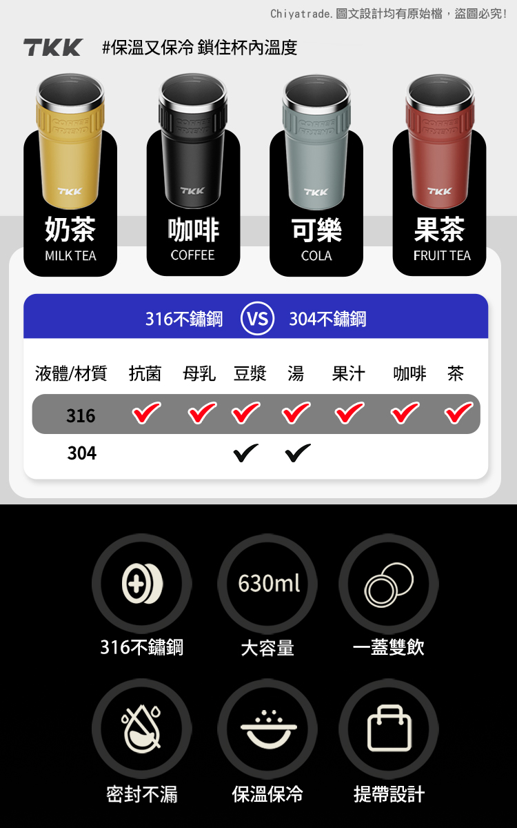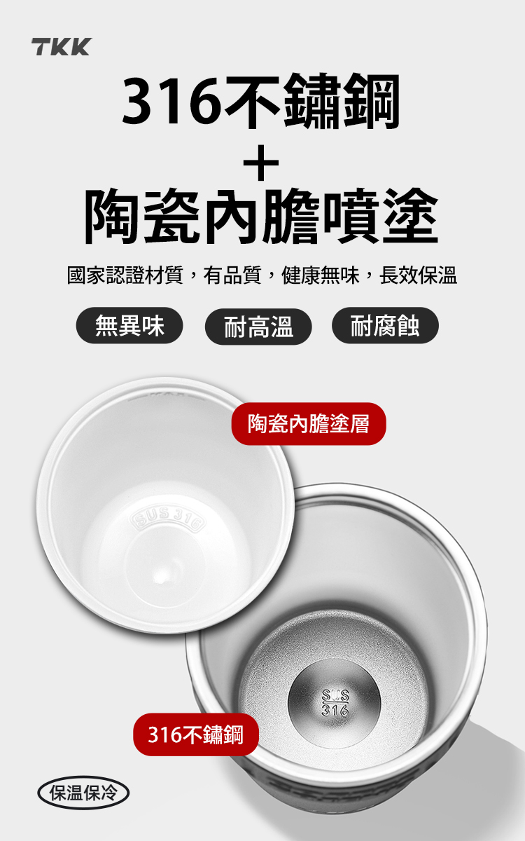 優質材料:由優質食品級316不鏽鋼內膽製成,耐腐蝕性強,安全健康。雙層真空隔熱設計,可讓飲料長效保溫保冷,長期鎖住溫度。