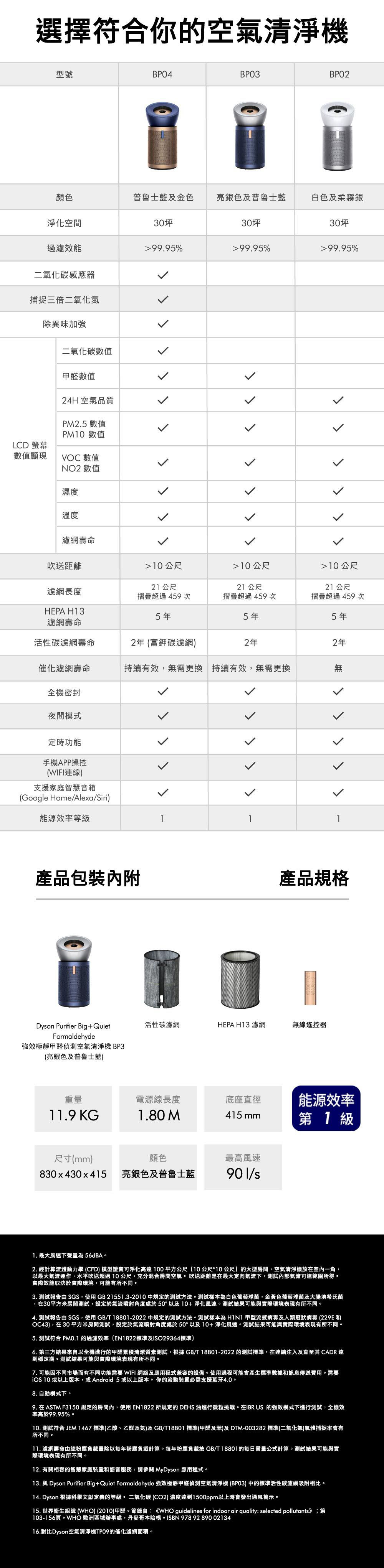 ●Dyson最寧靜、效能最強勁的空氣清淨機●強勁—吹送氣流超過10公尺-捕捉遠處的污染物,以淨化高達30坪空間。流線型可調節風管,能在最大風速下控制風向和強度。●強效並安靜-高速且低壓的系統能在最強效時產生只有 56dBA 的低噪音水平。獨特的迷宮式密封系統將空氣洩漏減至最低,確保寧靜1同時高效。●捕捉並鎖住污染物-360˚ HEPA H13 標準濾網,使用長達21公尺,經過超過459次折疊,能有效捕捉 99.95% 小至 PM0.1 的污染物。活性碳濾網有效捕捉有害氣體,例如苯及二氧化氮。5●持續偵測及消滅-PM2.5/PM10感應器即時分析並診斷空氣中的污染物,並在 LCD 上顯示結果。固態甲醛感應器能精準偵測甲醛,獨特的催化濾網則有效綜合感應系統,包含永久固態甲醛感應器,能自動偵測污染物。BP04具二氧化碳感應器,二氧化碳濃度高會影響健康及認知能力,若二氧化碳含量高出建議水平,機器便會準確匯報。使用者即使身處寬敞空間,也能持續呼吸潔淨空氣,同時好好掌控室內空氣品質。●全機密封過濾系統-符合 HEPA H13 標準。6捕捉到的,都牢牢鎖住。●一級能效