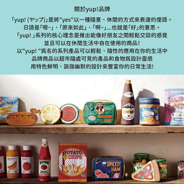 「yup! (ヤップ)」是將"yes"以一種隨意、休閒的方式來表達的俚語。日語是「嗯~」、「原來如此」、「啊~」...也就是「好」的意思。「yup! 」系列的核心理念是推出能像好朋友之間輕鬆交談的感覺並且可以在休閒生活中自在使用的商品!以"yup! "為名的系列產品可以輕鬆、隨性的應用在你的生活中品牌商品以超市隨處可見的產品和食物為設計靈感用特色鮮明、詼諧幽默的設計來豐富你的日常生活!