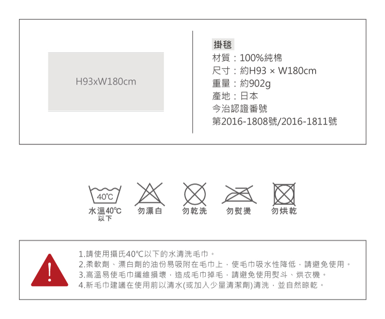 【掛毯】品牌:日本丸真材質:100%純棉尺寸:約W93 xL180/cm重量:約902g產地: 日本製今治認證番號第2016-1808號/2016-1811號