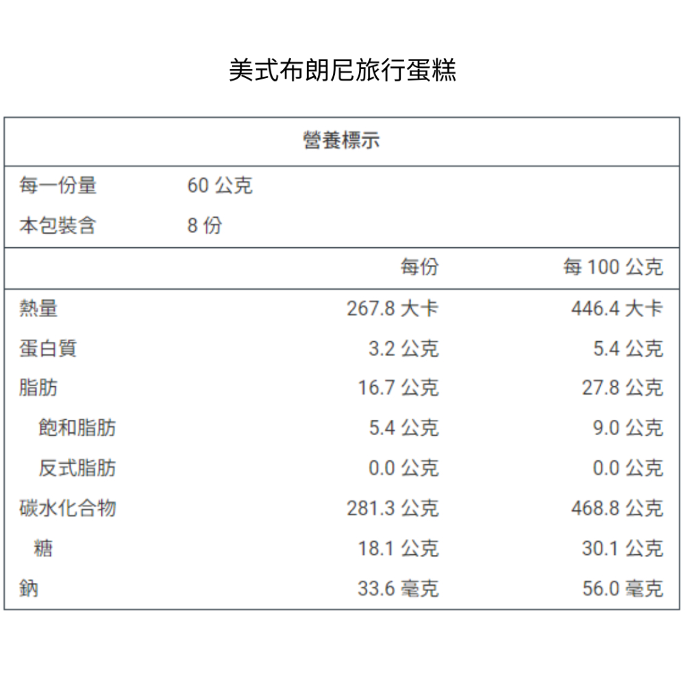 商品內容商品組合/規格:480g/盒商品品名:美式布朗尼旅行蛋糕商品重(容)量:480g±50g/盒內容物成分(如含有豬、牛成分請加註國別):蔓越莓乾、耐烤巧克力塊、雞蛋、糖、海藻糖、鹽、高筋麵粉、可可粉、無鋁泡打粉、寶鮮粉、植物油、香料、香草奶油醬、巧克力醬、糖霜(檸檬汁、糖粉)食品添加物名稱:如成分所示過敏原資訊:本產品含蛋、麩質的穀類、大豆、蜂蜜及其製品,不適合對其過敏體質者食用。原產地(國):台灣保存期限:常溫14天/冷凍30天食用方式:拆封後常溫可保存3天,請盡速食用完畢。
