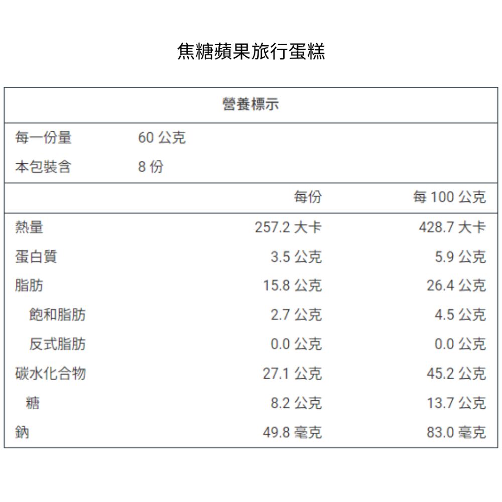 商品內容商品組合/規格:480g/盒商品品名:焦糖蘋果旅行蛋糕商品重(容)量:480g±50g/盒內容物成分(如含有豬、牛成分請加註國別):檸檬汁、雞蛋、黑糖、海藻糖、鹽、高筋麵粉、無鋁泡打粉、寶鮮粉、植物油、香料、香草奶油醬、蘋果糖漿、蘋果果乾、焦糖醬、糖霜(檸檬汁、糖粉)食品添加物名稱:如成分所示過敏原資訊:本產品含蛋、麩質的穀類、大豆、蜂蜜及其製品,不適合對其過敏體質者食用。原產地(國):台灣保存期限:常溫14天/冷凍30天食用方式:拆封後常溫可保存3天,請盡速食用完畢。