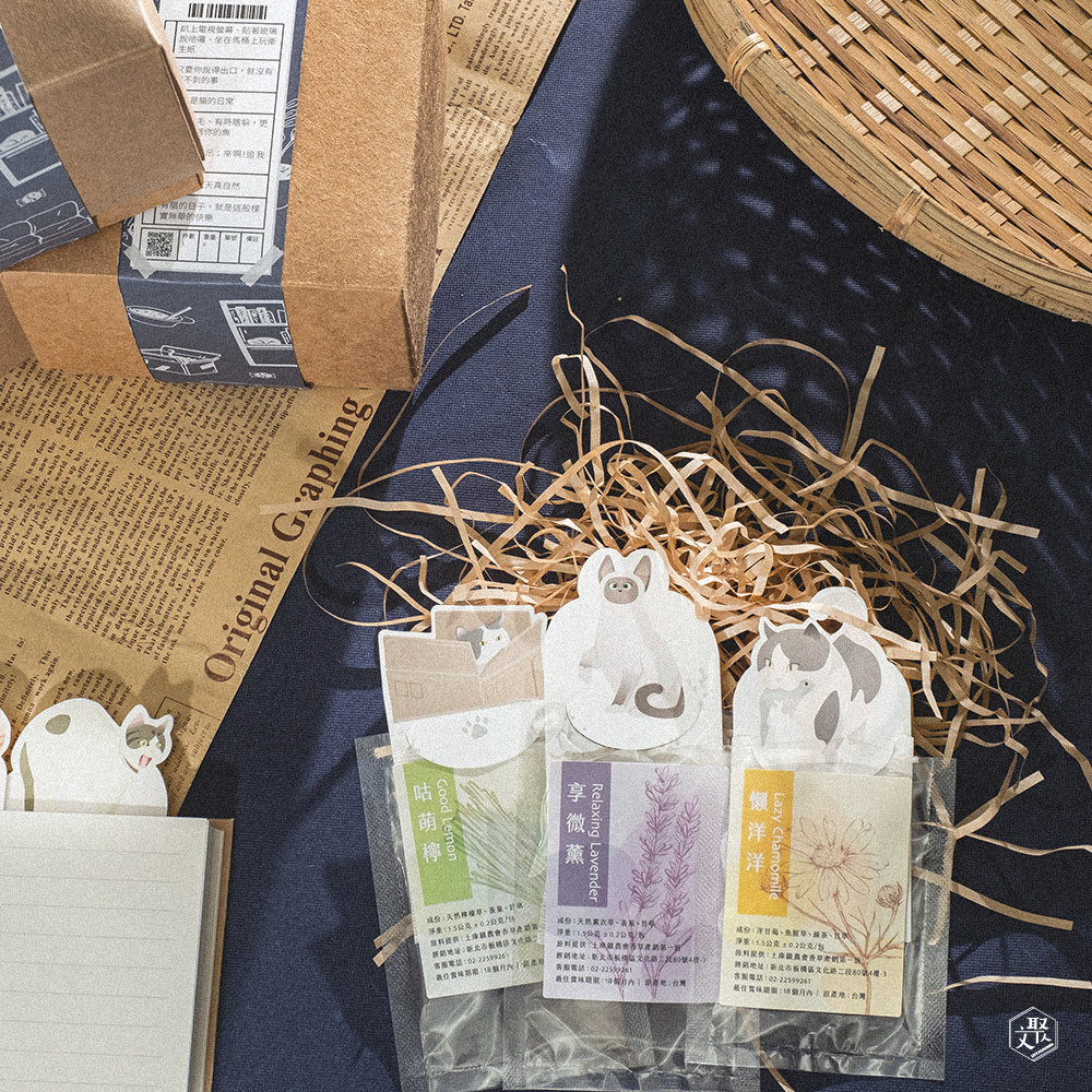 "四種風味,依照每天心情喝口茶手繪貓咪杯緣子書籤伴你優閒放鬆以台灣在地自然農法香草植物製作而成-無農藥、無化肥12款貓咪陪你療心事,度過每個生命的百款日常自用、交換禮物均是最佳選擇環保牛皮紙盒可重複再利用"